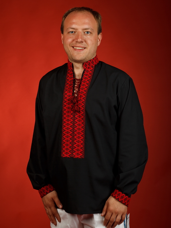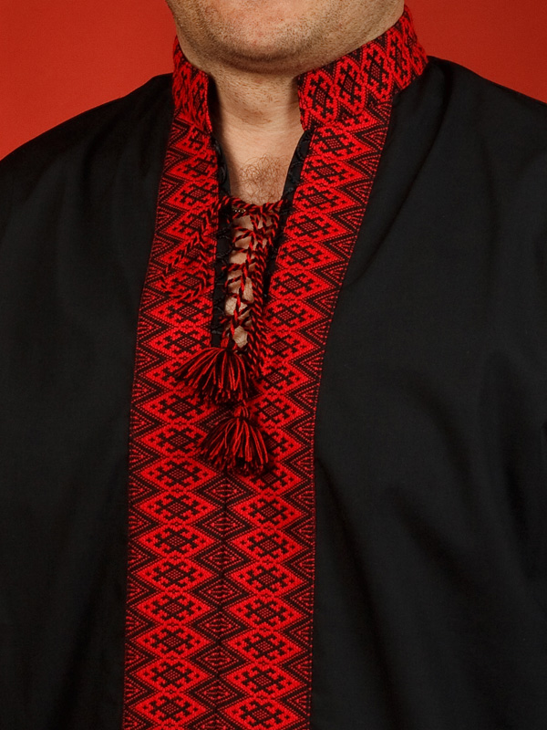 Вишиванка чорна - вишита чоловіча сорочка ЧС 7-18. Крій - український, традиційний. Комір - вишита стійка. Горловина на петлях зі шнурком та кутасами. Краї рукавів з вишивкою на манжет і ґудзик. Вишивка ткана, червоними та чорними акриловими нитками. Візерунок 18 - геометричний. Тканина якісна чорна сорочкова, можливе виготовлення із 100% бавовни або 100% льону.