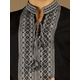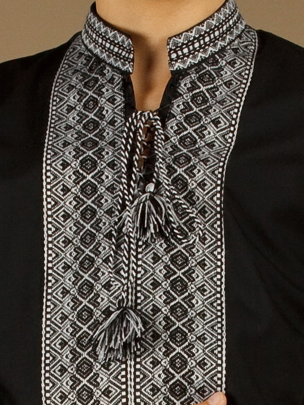 Вишиванка чорна - вишита чоловіча сорочка ЧС 7-5s. Крій - український, традиційний. Комір - вишита стійка. Горловина на петлях зі шнурком та кутасами. Краї рукавів з вишивкою на манжет і ґудзик. Вишивка ткана чорними та білими акриловими нитками. Візерунок 5 - геометричний. Тканина якісна чорна сорочкова, можливе виготовлення із 100% бавовни або 100% льону.