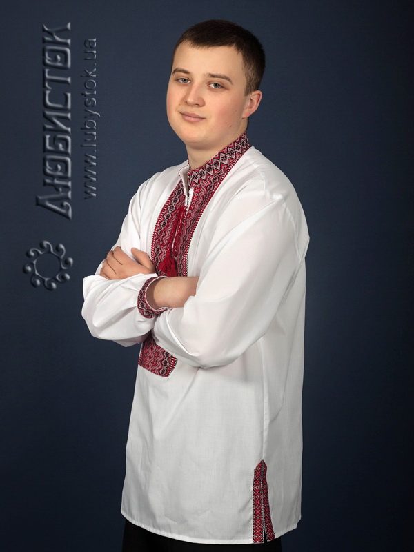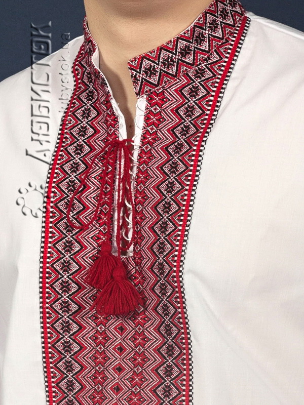 Вишиванка - вишита чоловіча сорочка ЧС 9-57. Крій - український, традиційний. Комір - вишита стійка. Горловина на петлях зі шнурком та кутасами. Краї рукавів з вишивкою на манжет і ґудзик. Вишивка ткана, червоними, чорними та білими акриловими нитками. Візерунок 57 - геометричний. Особливістю цієї сорочки є обшиті вишивкою розрізи по боках. Носиться на випуск. Тканина якісна біла сорочкова, можливе виготовлення із 100% бавовни або 100% льону.