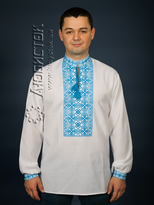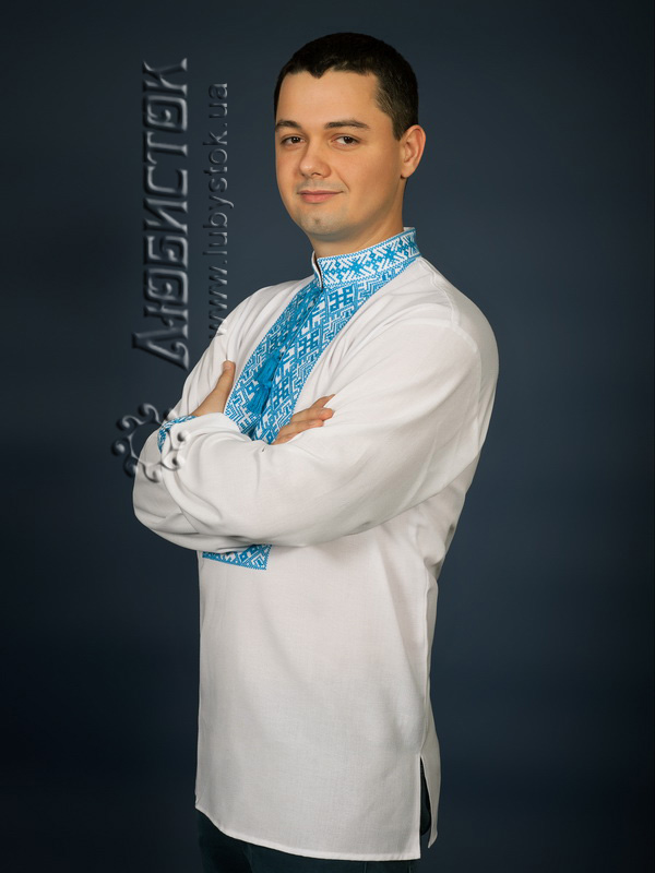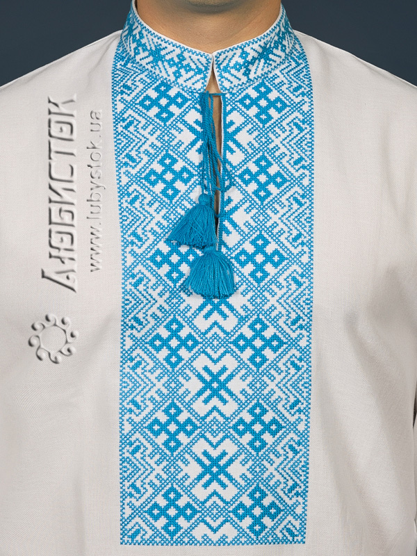 Вишита сорочка чоловіча - вишиванка хрестиком ЧСВ 1-4 на натуральному льоні. Через оригінальний візерунок має особливий вигляд. Традиційний український крій сорочки з білого натурального льону або домотканої тканини. Вишиванка виконана хрестиком блакитними акриловими нитками, геометричним візерунком. На довгий рукав з коміром-стійкою. Вишивка на грудях, манжетак та комірі-стійці. Чудово підійде як для святкових так і для днів коли хочеться мати особливий вигляд.