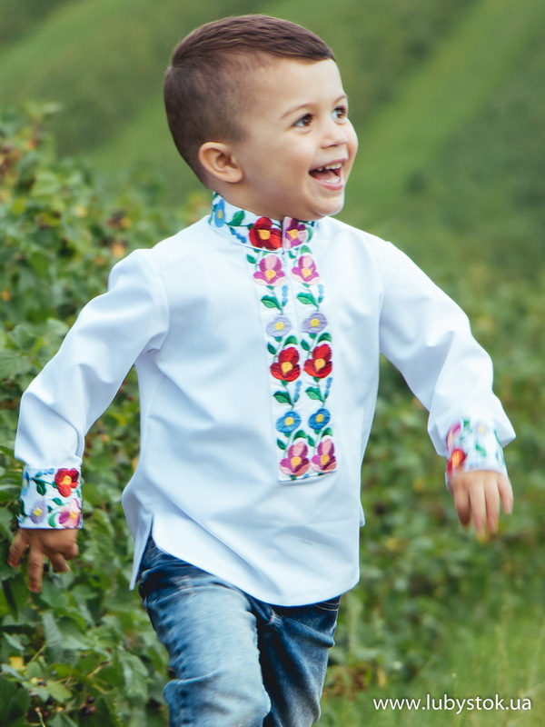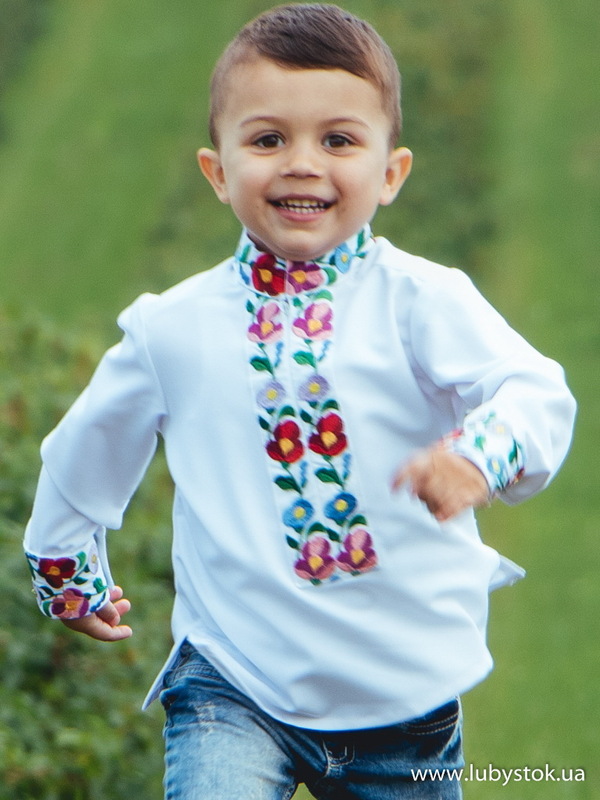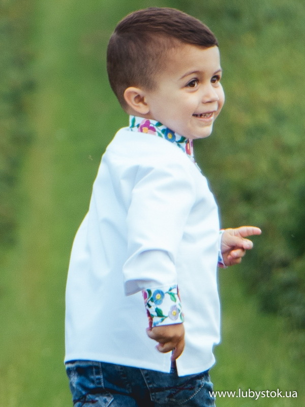 Вишиванка гладдю - вишита дитяча сорочка з рослинним орнаментом ЧСВ 68-1Д. Завдяки оригінальному візерунку має особливий вигляд. Сучасний український стиль сорочки з білого тіару. Вишиванка виконана гладдю кольоровими акриловими нитками, рослинним візерунком з квітами та листочками. Рукав довгий з коміром-стійкою. Вишивка на грудях, манжетах та комірі-стійці. Чудово підійде для урочистих та святкових події.