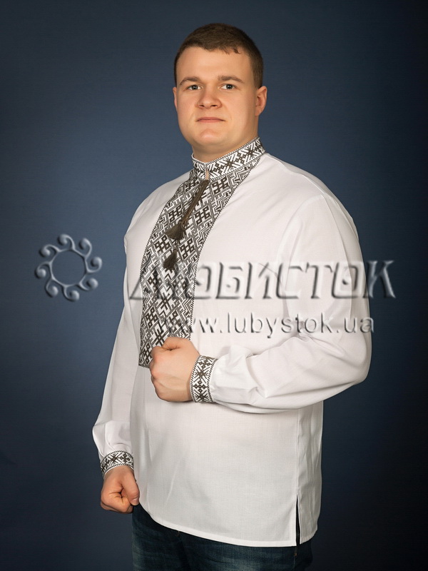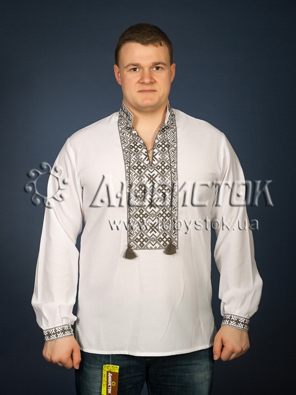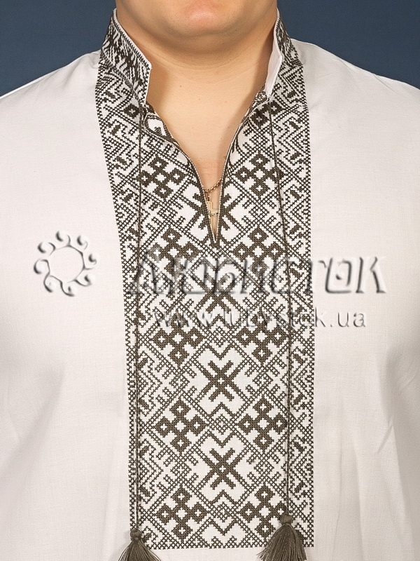 Вишита сорочка чоловіча - вишиванка хрестиком ЧСВ 1-6. Традиційний український крій сорочки з білої домотканої тканини або натурального льону. Вишиванка виконана хрестиком коричневими акриловими нитками, геометричним візерунком. На довгий рукав з коміром-стійкою. Вишивка на грудях, манжетак та комірі-стійці. Чудово підійде для святкових та урочистих подій.