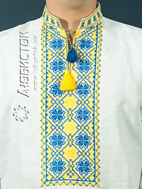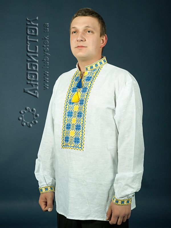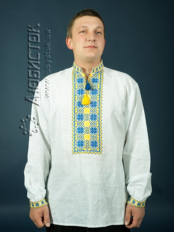 Вишита сорочка чоловіча - вишиванка хрестиком ЧСВ 4-5. Традиційний український крій сорочки на довгий рукав з коміром-стійкою. Вишиванка одягається через голову. Вишивка на грудях, кінцях рукавів, комірі-стійці.