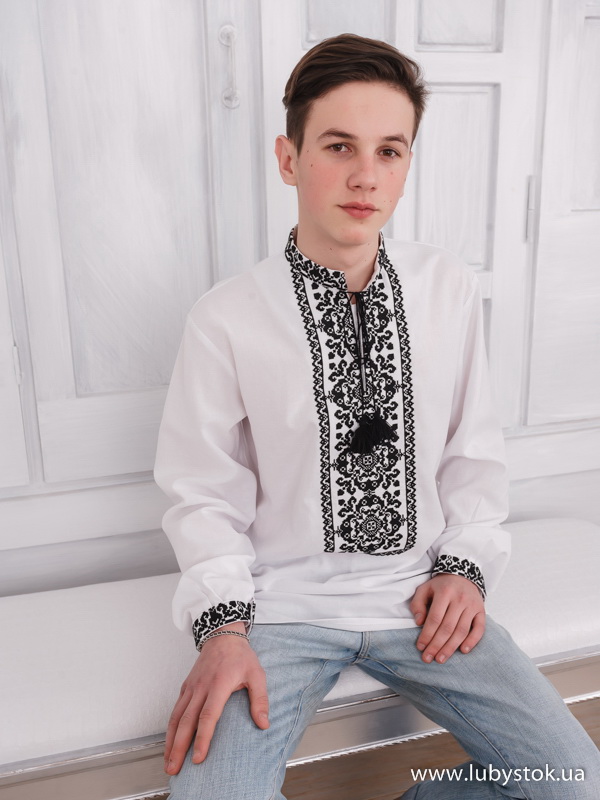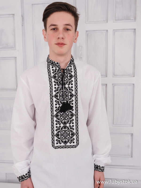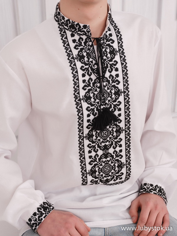 Вишиванка хрестиком - вишита сорочка чоловіча С 109-1 з рослинним орнаментом чорними акриловими никами на білому домотканому полотні. Стиль традиційний з коміром-стійкою і довгим рукавом. Вишивка на комірі, грудях та манжетах.