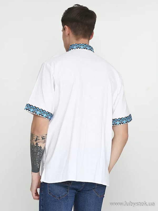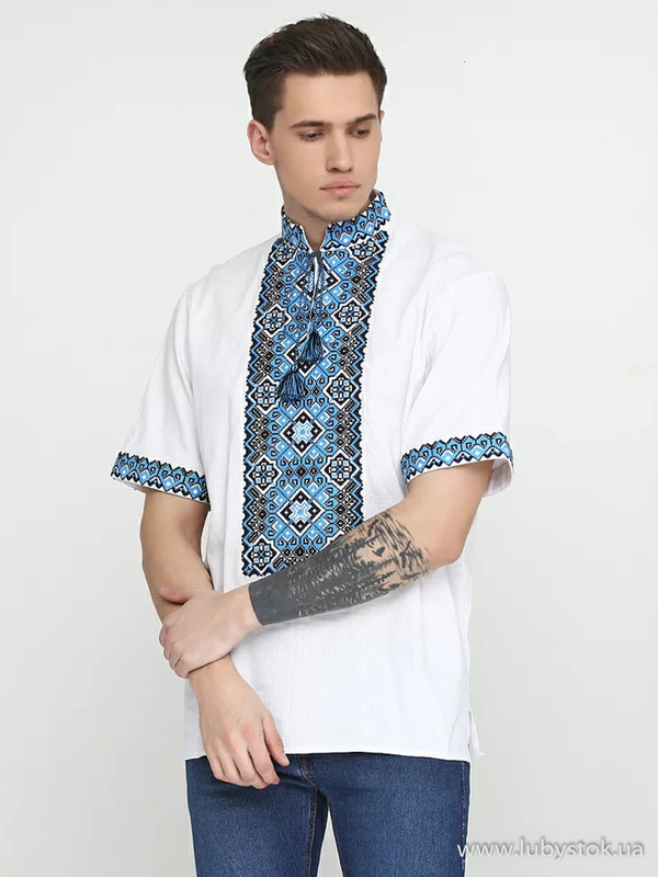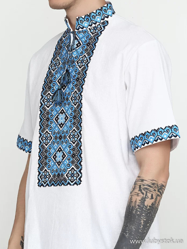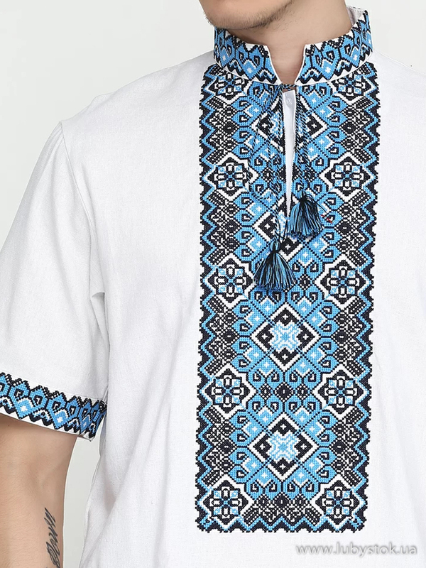 Вишита сорочка чоловіча - вишиванка хрестиком С 11-2 .Багатий візерунок та блакитний колір, надають цій сорочці оригінальності. Традиційний український крій сорочки з білої домотканої тканини або натурального льону. Вишиванка виконана хрестиком блакитними акриловими нитками, геометричним візерунком. На довгий рукав з коміром-стійкою. Вишивка на грудях, манжетак та комірі-стійці. Чудово підійде для національних свят та урочистих подій. Надасть вам особливий вигляд.
