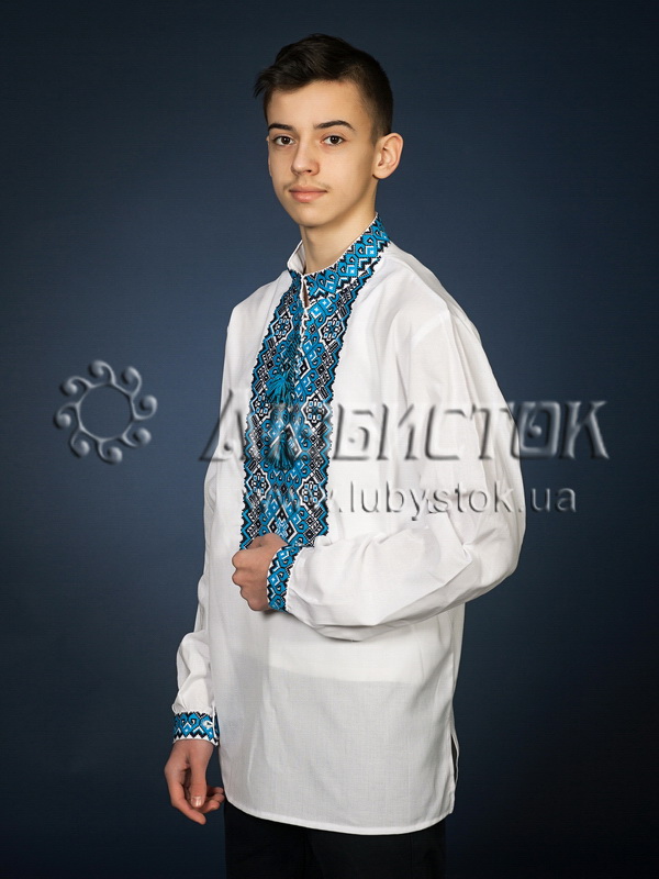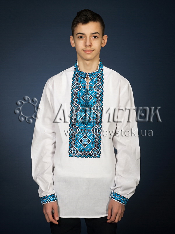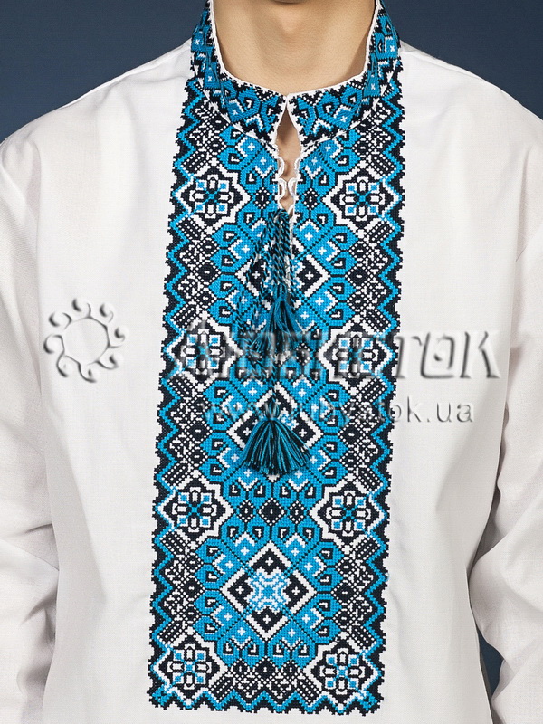 Вишита сорочка чоловіча - вишиванка хрестиком С 11-7. Традиційний український крій сорочки з білої домотканої тканини або натурального льону. Вишиванка виконана хрестиком синіми та блакитними акриловими нитками, геометричним візерунком. На довгий рукав з коміром-стійкою. Вишивка на грудях, манжетак та комірі-стійці. Чудово підійде для будь-якої події.