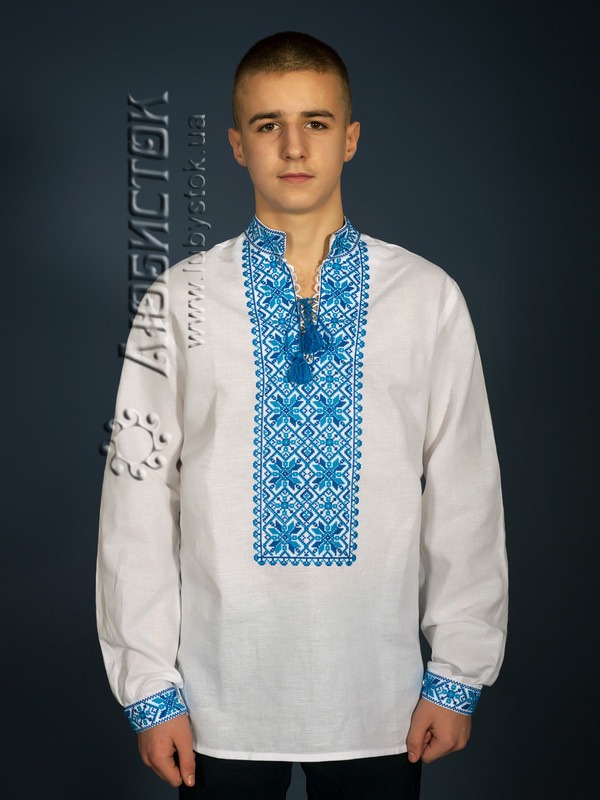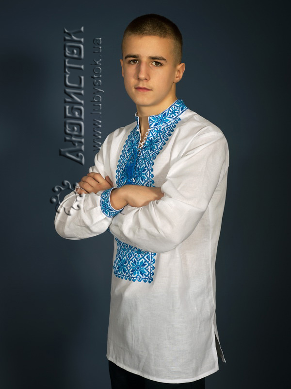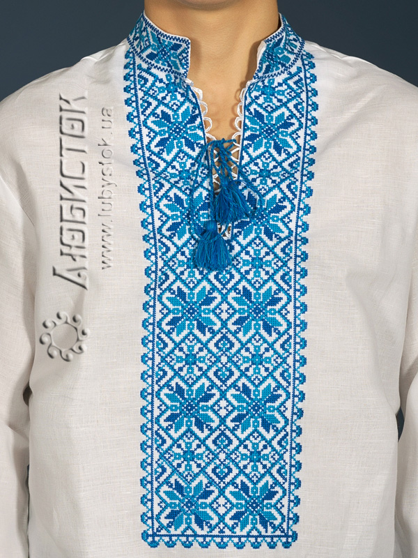 Вишита сорочка чоловіча - вишиванка хрестиком ЧСВ 12-2 на домотканному полотні або натуральному льоні. Традиційний український крій сорочки на довгий рукав з коміром-стійкою. Вишивка на грудях, кінцях рукавів, комірі-стійці. Виконана хрестиком блакитними та синіми акриловими нитками, геометричним візерунком. Оригінальний візерунок та підібрані кольори зробить вас неповторним та вирізнить з натовпу.