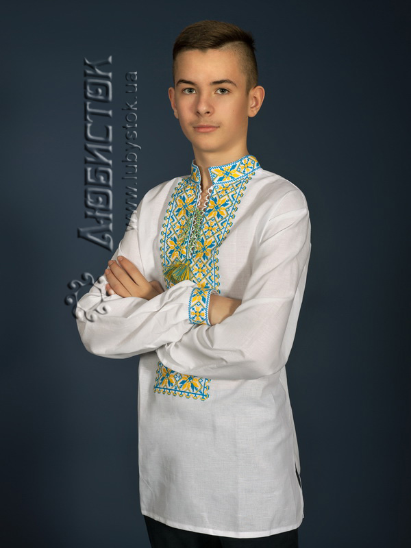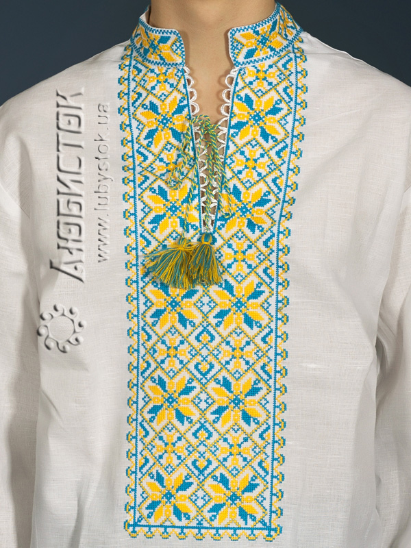 Вишита сорочка чоловіча - вишиванка хрестиком ЧСВ 12-6 на домотканному полотні або натуральному льоні. Традиційний український крій сорочки на довгий рукав з коміром-стійкою. Вишивка на грудях, кінцях рукавів, комірі-стійці. Виконана хрестиком жовтими та блакитними акриловими нитками, геометричним візерунком. Оригінальний візерунок та підібрані кольори зробить вас неповторним та вирізнить з натовпу. Ця сорочка чудово підійде для національних свят та урочистих подій.