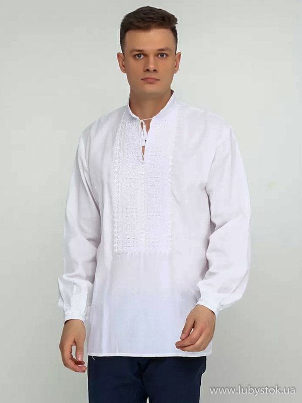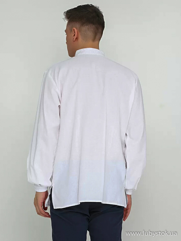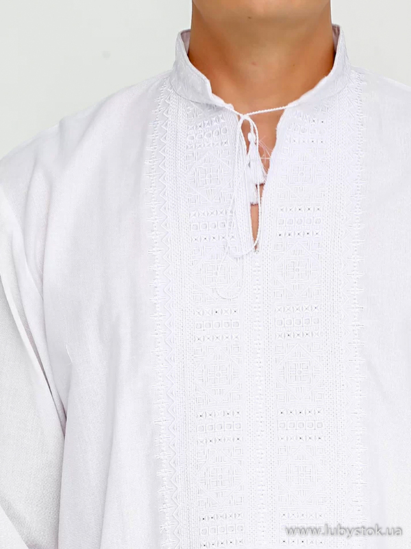 Вишиванка білим по білому С 13-1 - чоловіча сорочка вишита гладдю білими шовковими нитками на домотканому полотні або натуральному вибіленому льоні в полтавському стилі. Традиційний український крій сорочки на довгий рукав з коміром-стійкою. Вишивка на грудях, кінцях рукавів, комірі-стійці. Ця сорочка має оригінальний та особливий вигляд. Чудово підійде для особливих та урочистих подій.