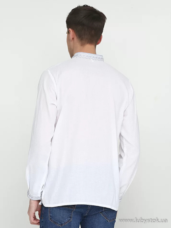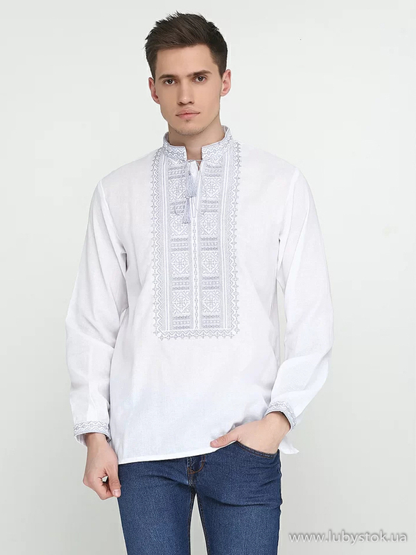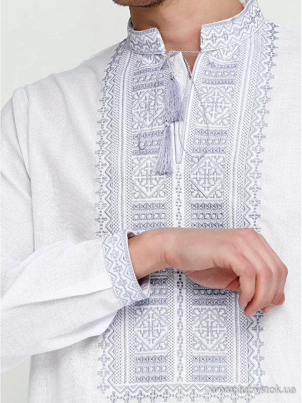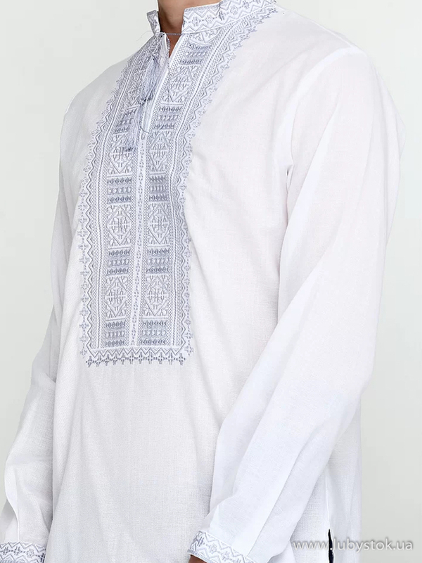 Вишита сорочка - вишиванка С 13-3 - чоловіча сорочка вишита гладдю сірими віскозними нитками на домотканому полотні або натуральному вибіленому льоні з оригінальним візерунком. Традиційний український крій сорочки на довгий рукав з коміром-стійкою. Вишивка на грудях, кінцях рукавів, комірі-стійці. Ця сорочка має оригінальний та особливий вигляд. Чудово підійде для особливих та урочистих подій.