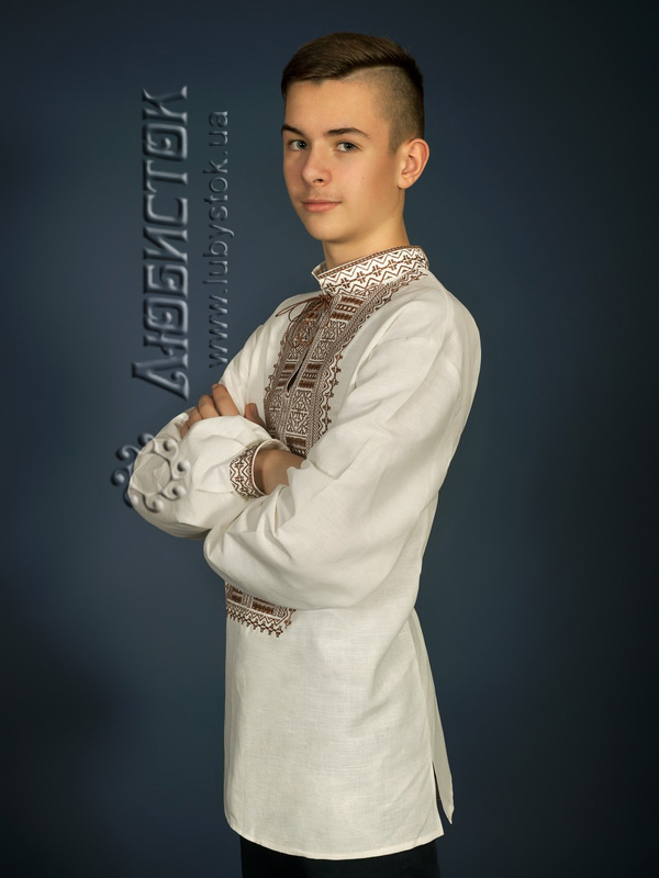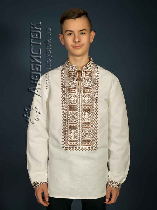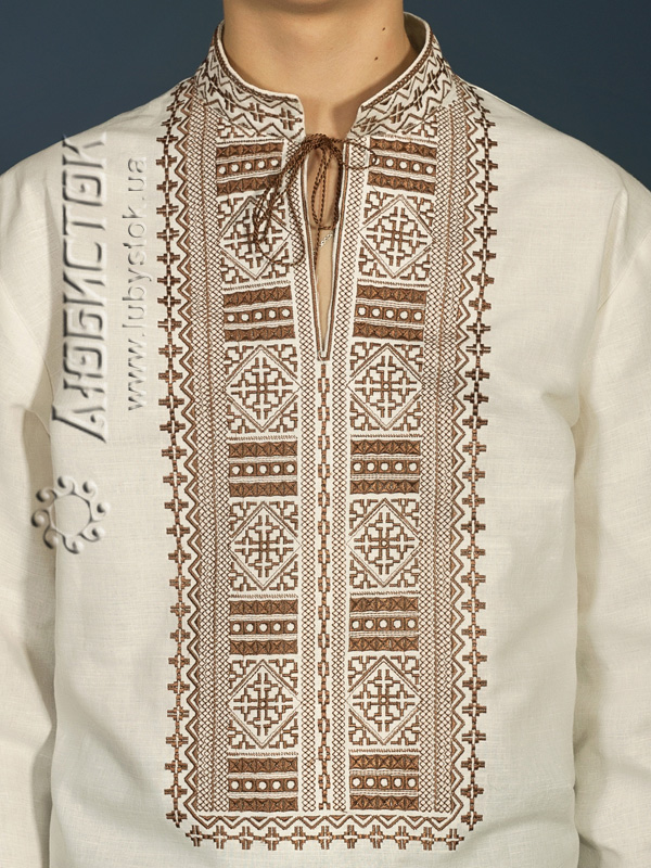 Вишита сорочка чоловіча - вишиванка гладдю С 13-6 чоловіча сорочка вишита гладдю коричневими шовковими нитками на домотканому полотні або натуральному вибіленому льоні в полтавському стилі. Традиційний український крій сорочки на довгий рукав з коміром-стійкою. Вишивка на грудях, кінцях рукавів, комірі-стійці. Ця сорочка має оригінальний та особливий вигляд. Чудово підійде для особливих та урочистих подій.