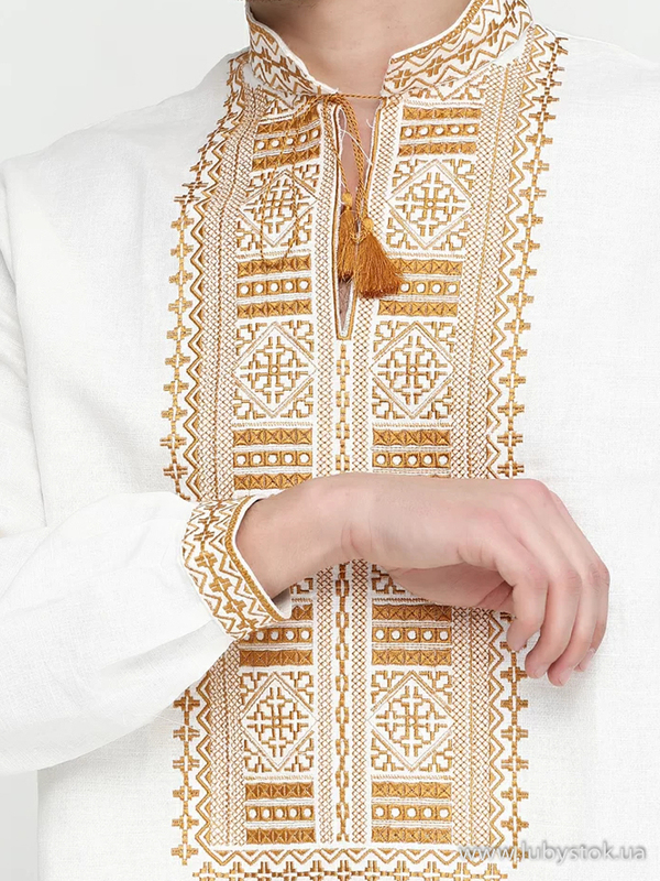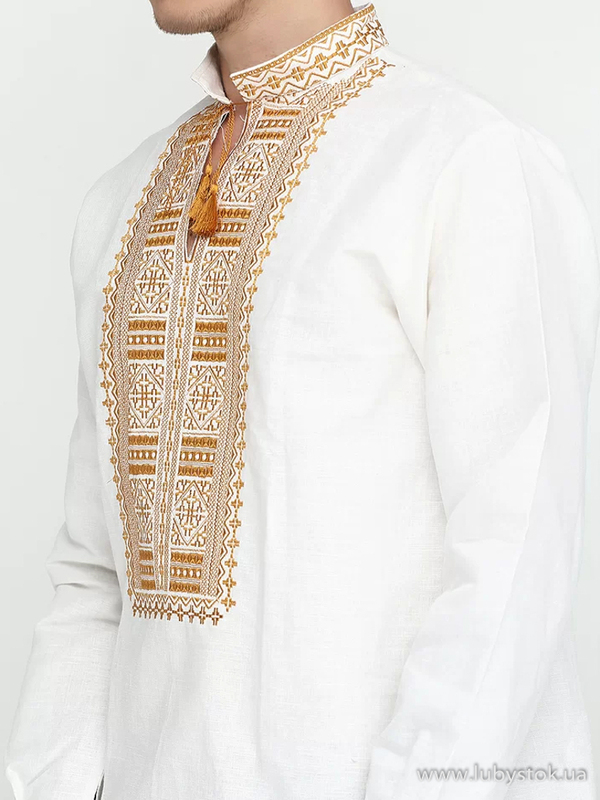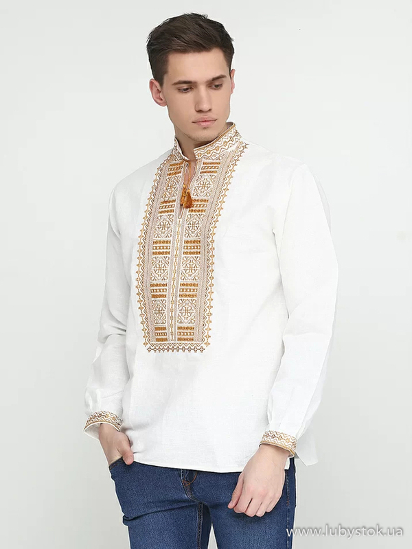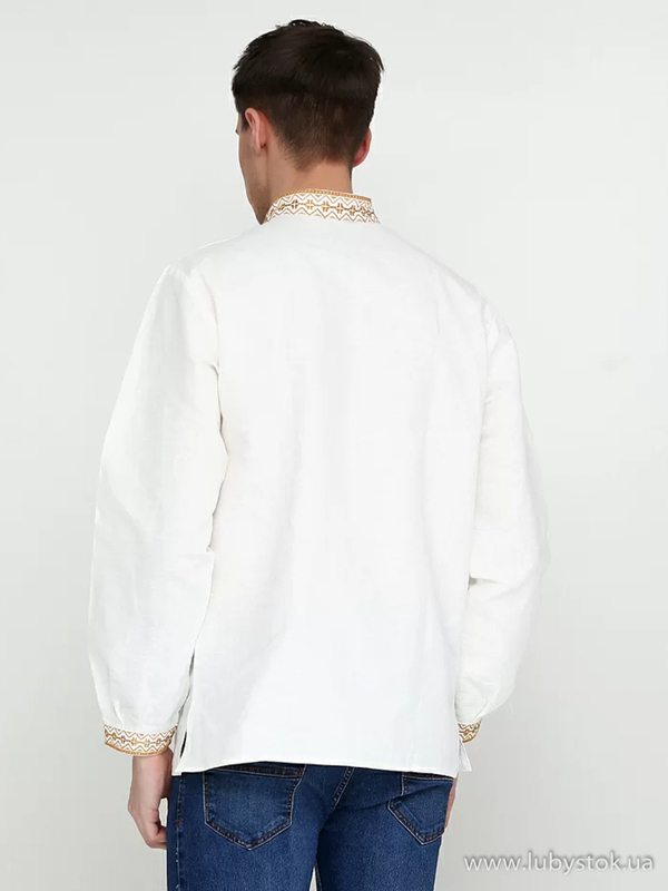 Вишита сорочка чоловіча - вишиванка гладдю С 13-7 чоловіча сорочка вишита гладдю коричневими шовковими нитками на домотканому полотні або натуральному вибіленому льоні в полтавському стилі. Традиційний український крій сорочки на довгий рукав з коміром-стійкою. Вишивка на грудях, кінцях рукавів, комірі-стійці. Ця сорочка має оригінальний та особливий вигляд. Чудово підійде для особливих та урочистих подій.