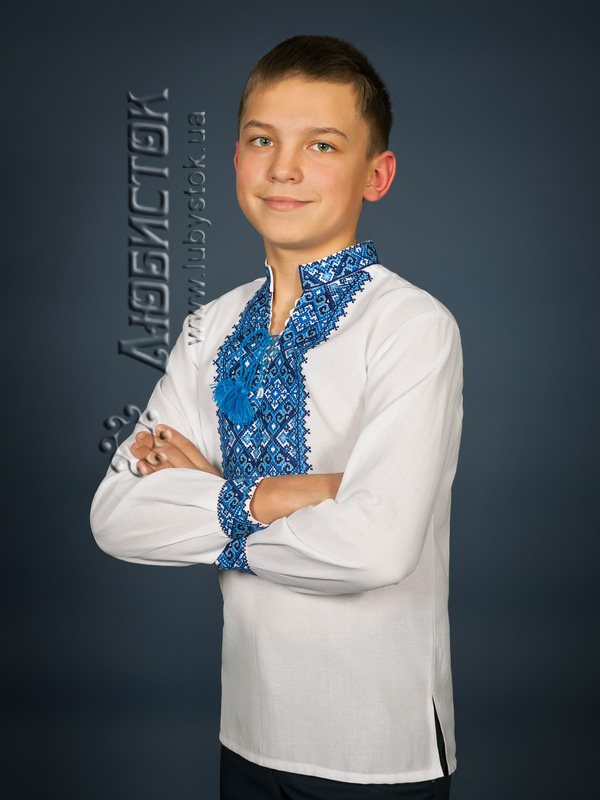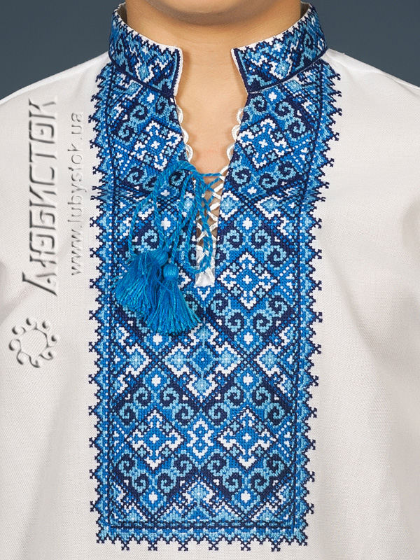 Вишита сорочка дитяча - вишиванка для хлопчика хрестиком ЧСВ 15-2-Д на домотканному полотні. Традиційний український крій сорочки на довгий рукав з коміром-стійкою. Вишивка на грудях, кінцях рукавів, комірі-стійці.