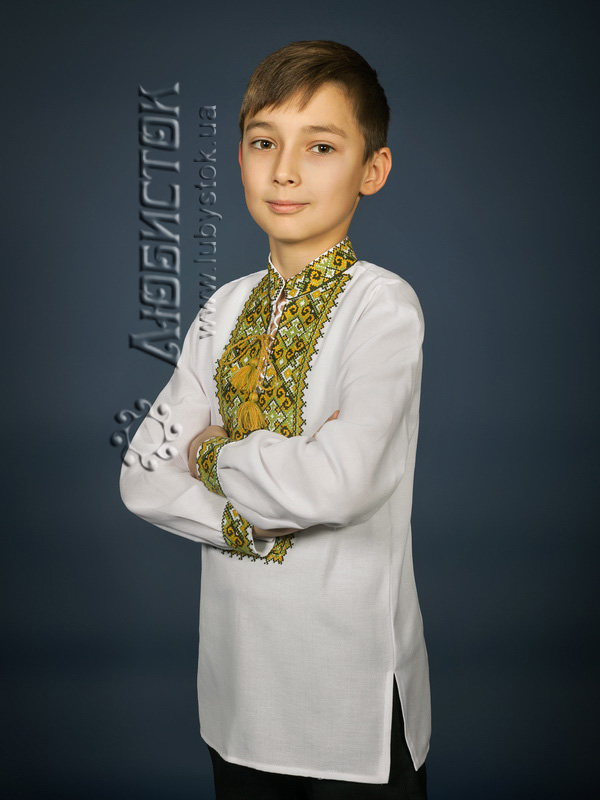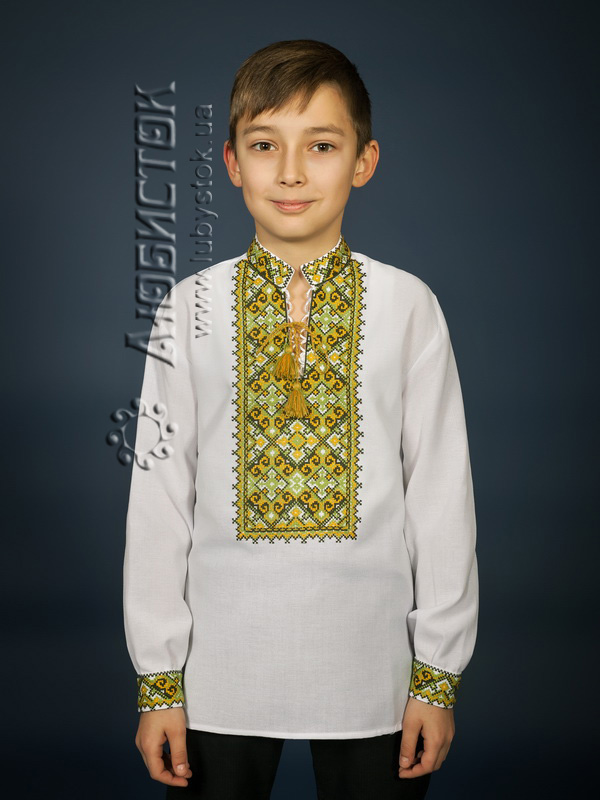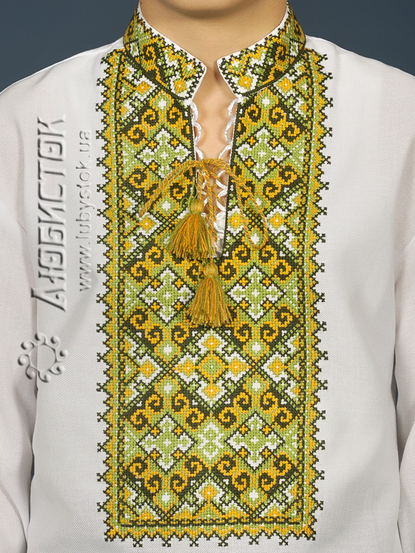 Вишита сорочка дитяча - вишиванка для хлопчика хрестиком ЧСВ 15-7-Д на домотканному полотні. Традиційний український крій сорочки на довгий рукав з коміром-стійкою. Вишивка на грудях, кінцях рукавів, комірі-стійці.