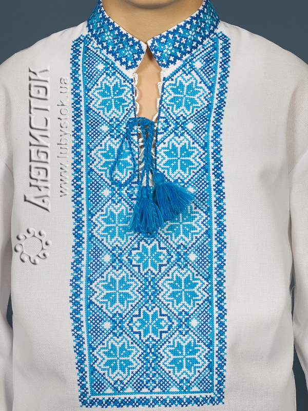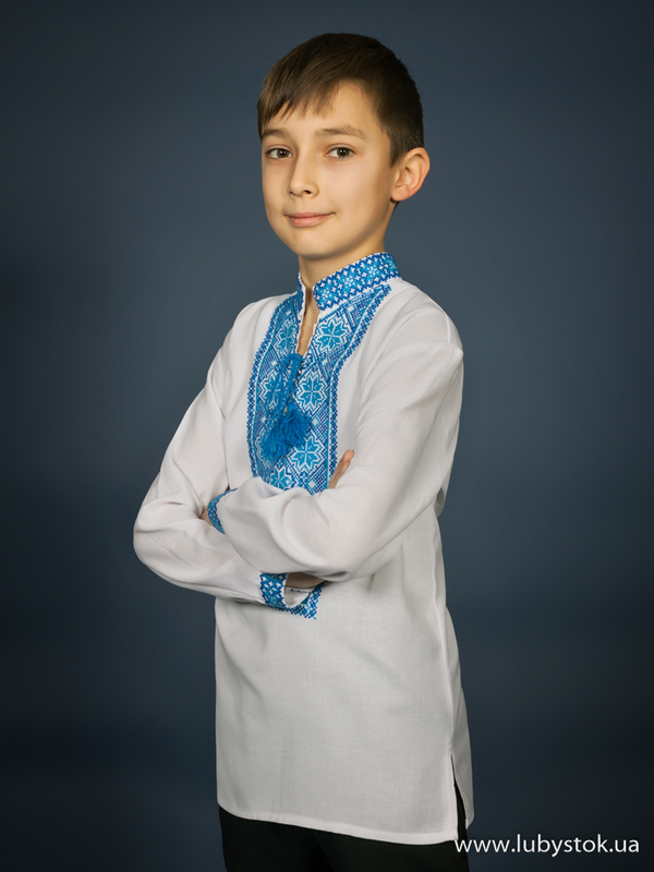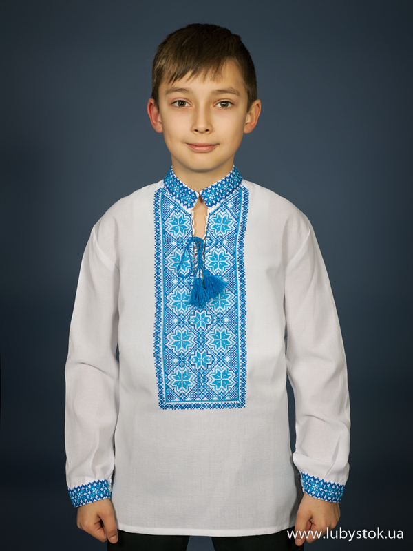 Вишита сорочка дитяча - вишиванка для хлопчика хрестиком ЧСВ 17-2-Д на домотканному полотні. Традиційний український крій сорочки на довгий рукав з коміром-стійкою. Вишивка на грудях, кінцях рукавів, комірі-стійці.