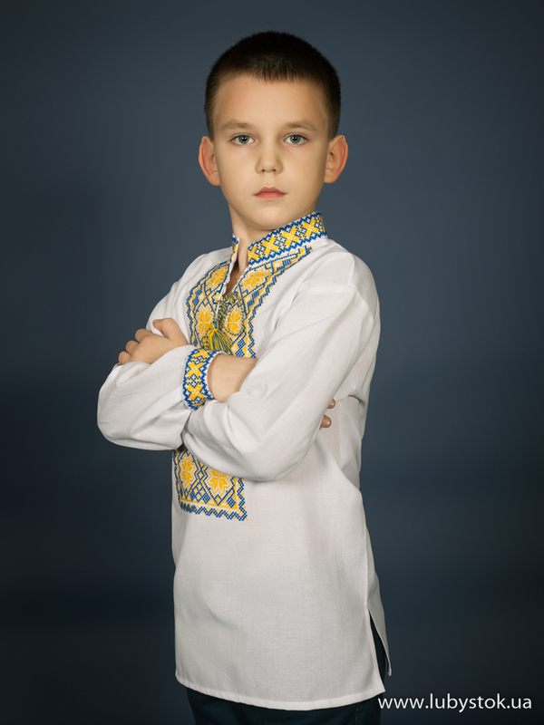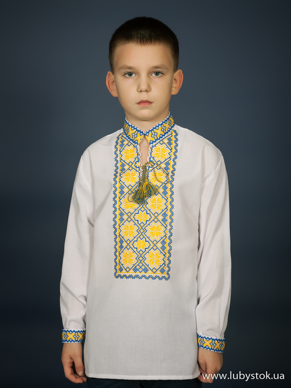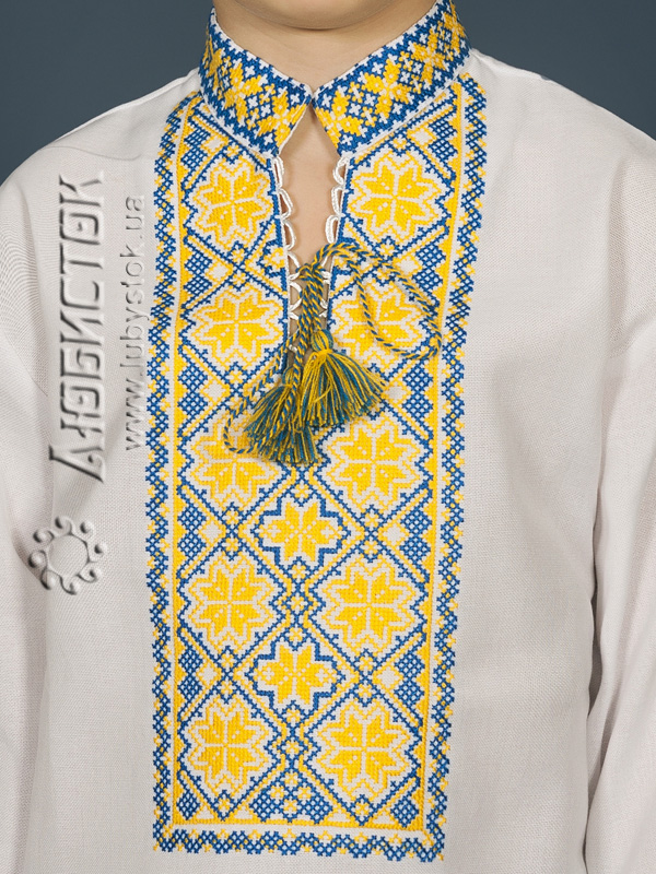 Вишита сорочка дитяча - вишиванка для хлопчика хрестиком ЧСВ 17-3-Д на домотканному полотні. Традиційний український крій сорочки на довгий рукав з коміром-стійкою. Вишивка на грудях, кінцях рукавів, комірі-стійці.