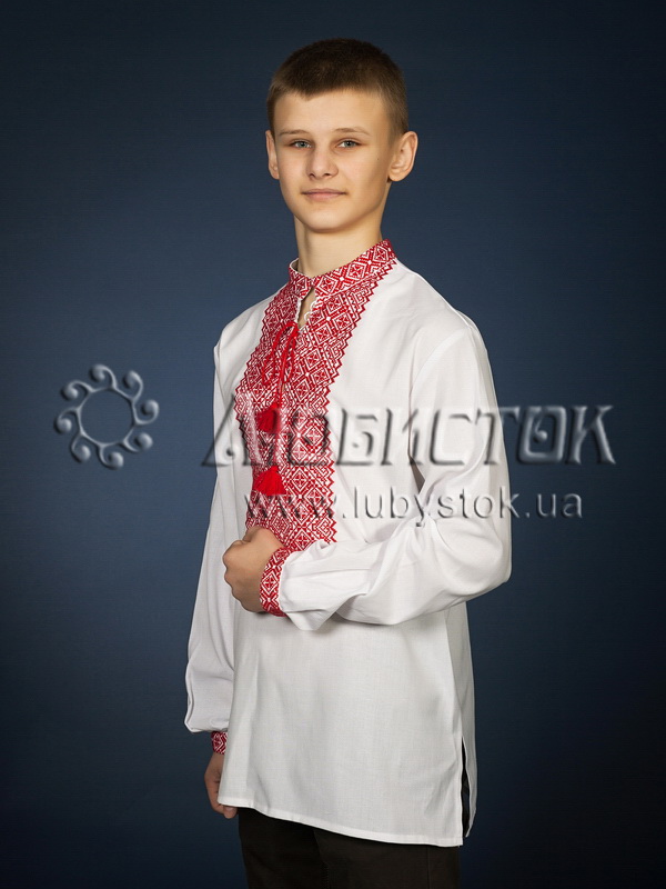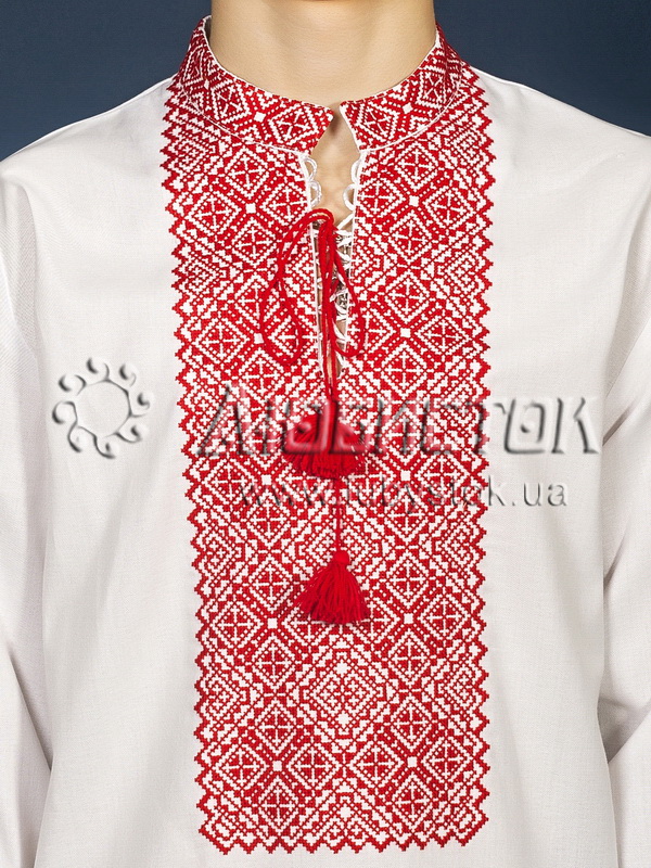 Вишита сорочка чоловіча - вишиванка хрестиком ЧСВ 18-1. Візерунок-оберіг червоними акриловими нитками. Традиційний український крій сорочки на довгий рукав з коміром-стійкою. Вишивка на грудях, кінцях рукавів, комірі-стійці.