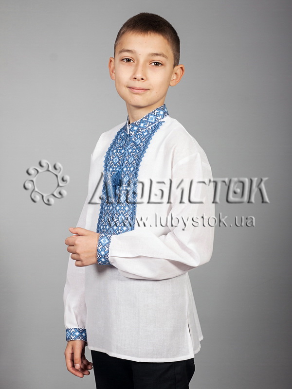 Вишита сорочка дитяча - вишиванка для хлопчика хрестиком ЧСВ 20-5-Д на домотканному полотні. Традиційний український крій сорочки на довгий рукав з коміром-стійкою. Вишивка на грудях, кінцях рукавів, комірі-стійці.