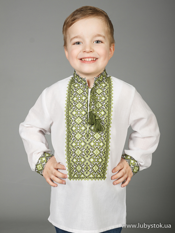 Вишита сорочка дитяча - вишиванка для хлопчика хрестиком ЧСВ 20-6-Д на домотканному полотні. Традиційний український крій сорочки на довгий рукав з коміром-стійкою. Вишивка на грудях, кінцях рукавів, комірі-стійці.