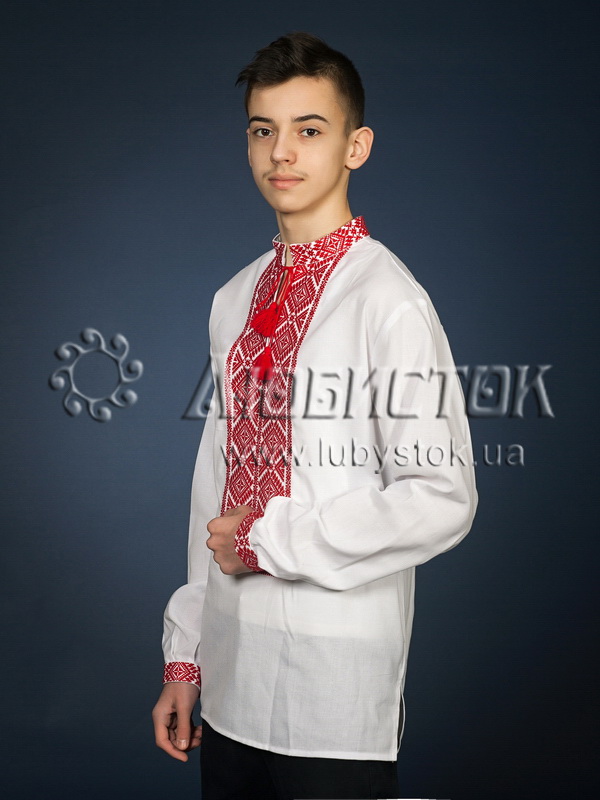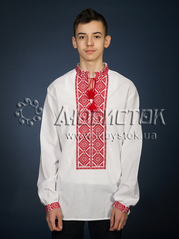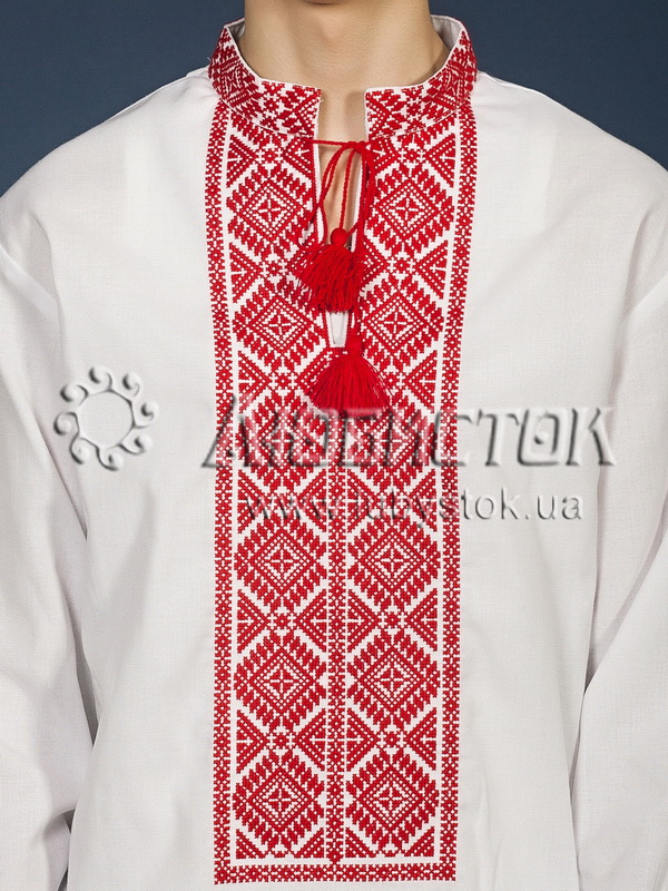 Вишита сорочка чоловіча - вишиванка хрестиком ЧСВ 21-1. Візерунок-оберіг червоними акриловими нитками. Традиційний український крій сорочки на довгий рукав з коміром-стійкою. Вишивка на грудях, кінцях рукавів, комірі-стійці.