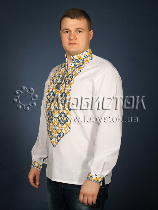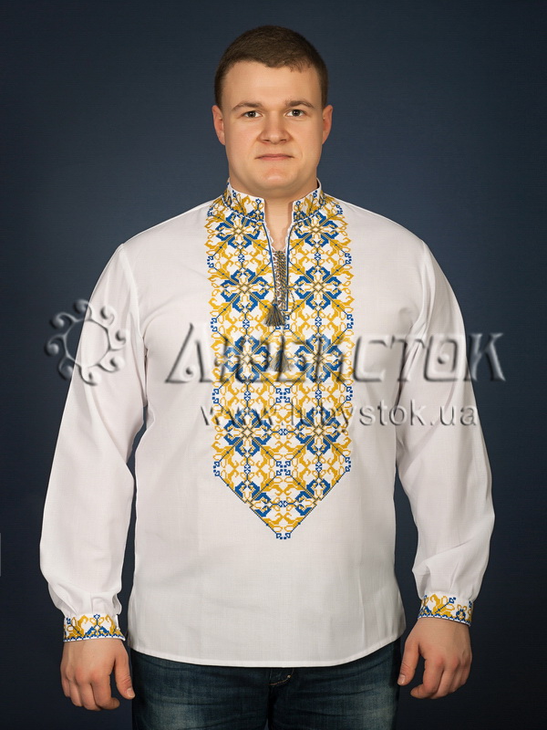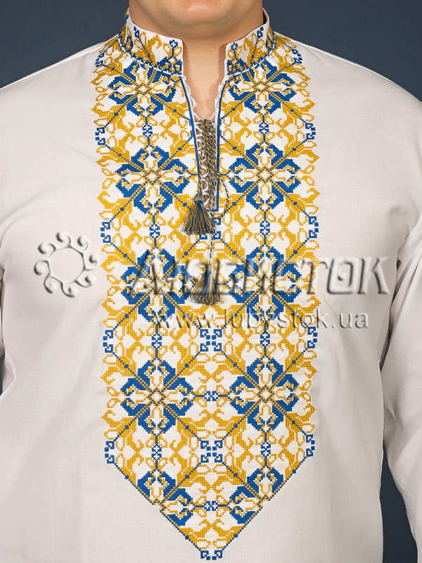 Вишита сорочка чоловіча - вишиванка хрестиком ЧСВ 22-5 на домотканному полотні або натуральному льоні. Візерунок акриловими нитками з рослинним орнаментом. Традиційний український крій сорочки на довгий рукав з коміром-стійкою. Вишивка на грудях, кінцях рукавів, комірі-стійці.