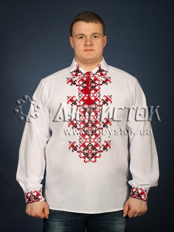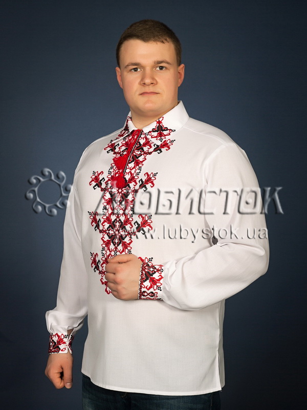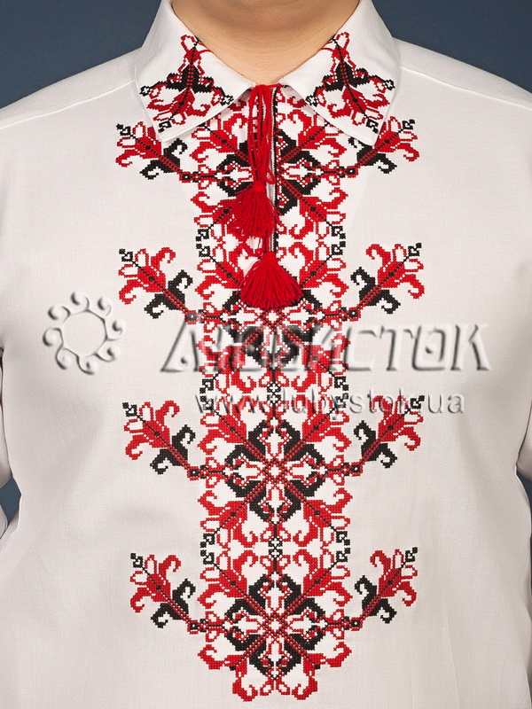 Вишита сорочка чоловіча - вишиванка хрестиком ЧСВ 23-1. Завдяки візерунку та відкладному комірці має оригінальний вигляд. Сучасний крій на домотканному полотні або натуральному льоні. Візерунок вишито червоними та чорними акриловими нитками, рослинно-геометричним орнаментом. На довгий рукав з відкладним коміром. Вишивка на грудях, манжетах та комірі-стійці. Цю сорочку можна одягнути на святкові та особливі події.