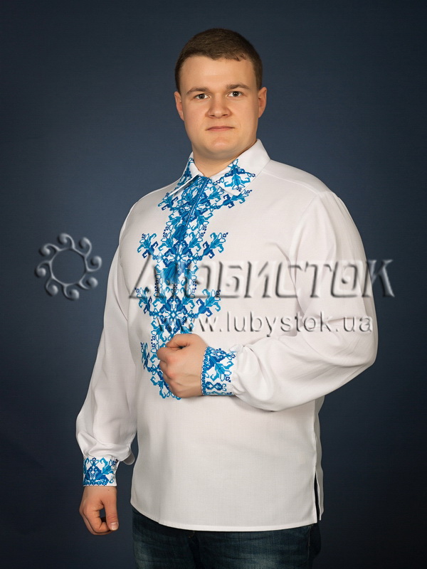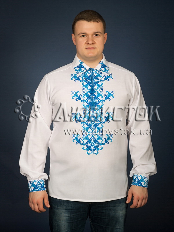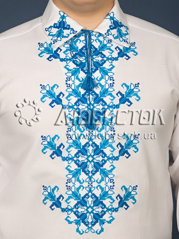 Вишита сорочка чоловіча - вишиванка хрестиком ЧСВ 23-4 на домотканному полотні або натуральному льоні. Візерунок блакитми акриловими нитками з рослинним орнаментом. Сучасний крій сорочки на довгий рукав з відкладним коміром. Вишивка на грудях, кінцях рукавів, комірі-стійці.