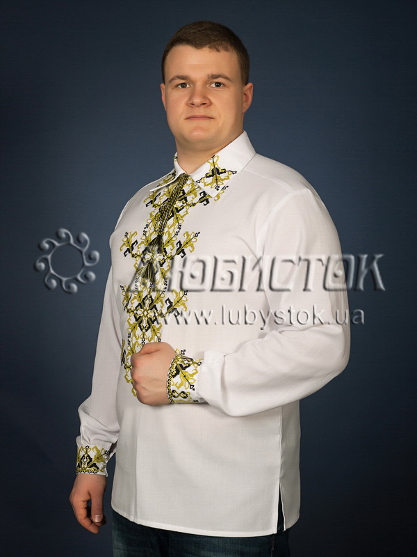 Вишита сорочка чоловіча - вишиванка хрестиком ЧСВ 23-6 на домотканному полотні або натуральному льоні. Візерунок зеленими акриловими нитками з рослинним орнаментом. Сучасний крій сорочки на довгий рукав з відкладним коміром. Вишивка на грудях, кінцях рукавів, комірі-стійці.