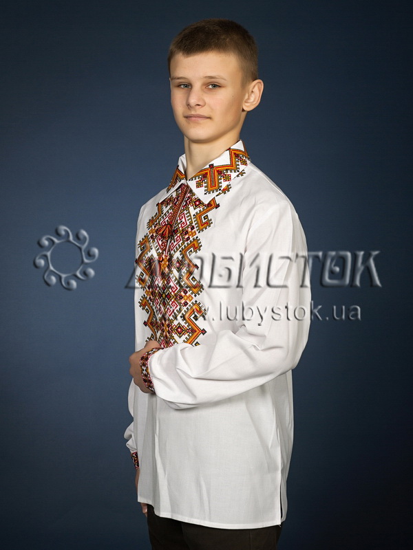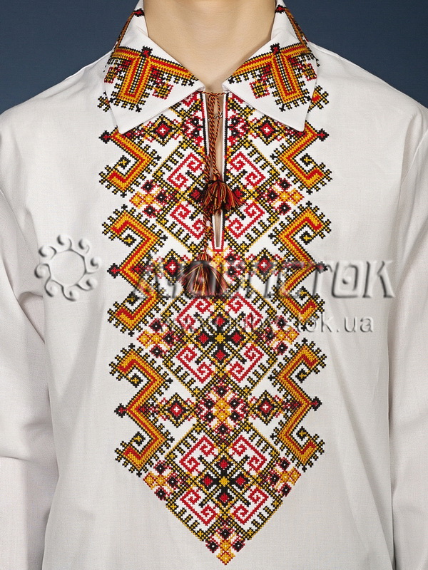 Вишита сорочка чоловіча - вишиванка хрестиком С 24-1 на домотканному полотні або натуральному льоні. Візерунок-оберіг в українському гуцульському стилі акриловими нитками. Сучасний крій сорочки на довгий рукав з відкладним коміром. Вишивка на грудях, кінцях рукавів, комірі.