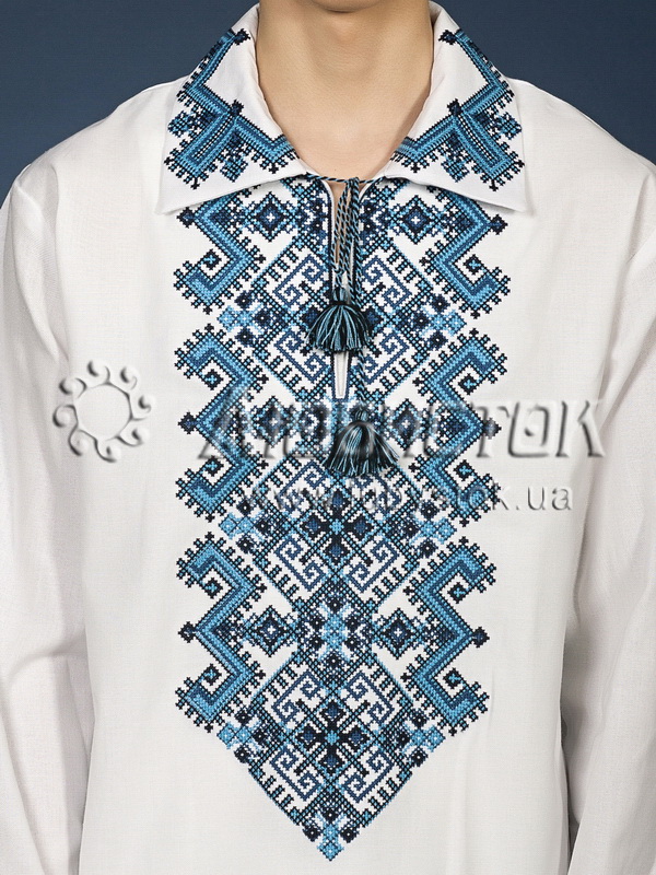 Вишита сорочка чоловіча - вишиванка хрестиком С 24-4 на домотканному полотні або натуральному льоні. Візерунок-оберіг в українському гуцульському стилі акриловими нитками. Сучасний крій сорочки на довгий рукав з відкладним коміром. Вишивка на грудях, кінцях рукавів, комірі.