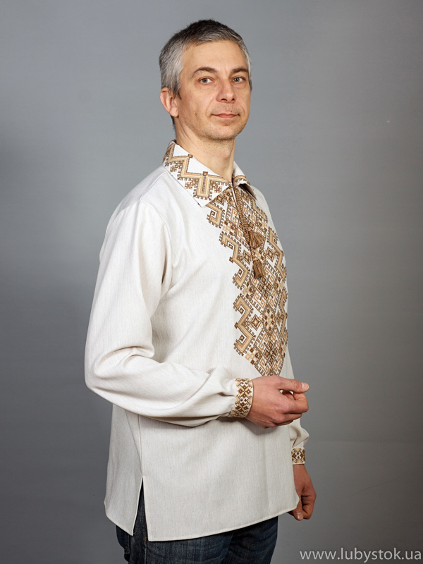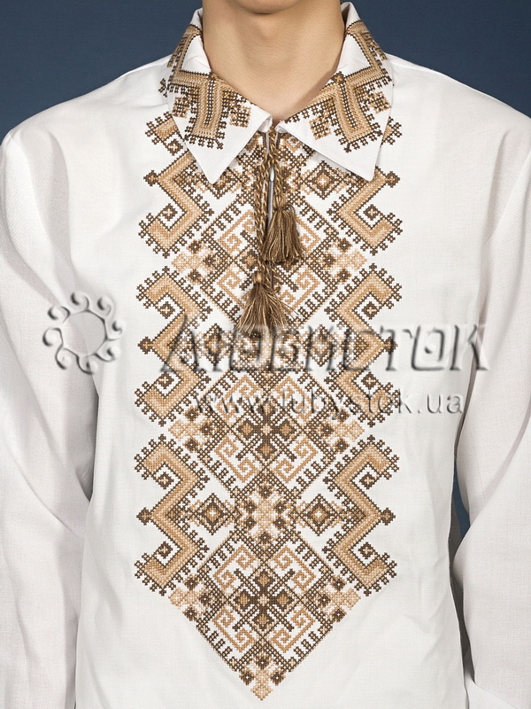 Вишита сорочка чоловіча - вишиванка хрестиком С 24-5 на домотканному полотні або натуральному льоні. Візерунок-оберіг в українському гуцульському стилі акриловими нитками. Сучасний крій сорочки на довгий рукав з відкладним коміром. Вишивка на грудях, кінцях рукавів, комірі.