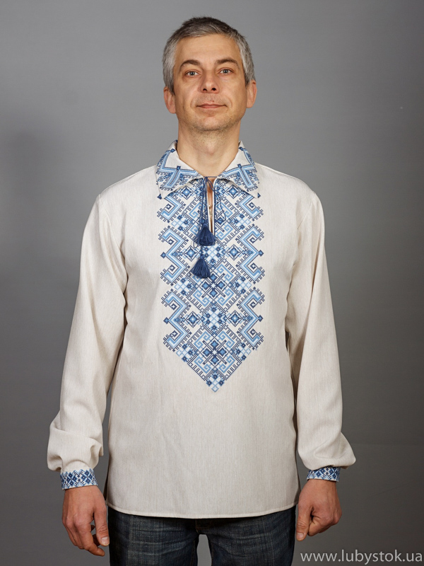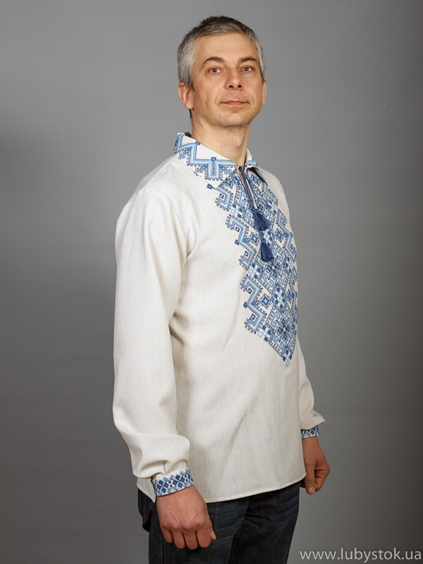 Вишита сорочка чоловіча - вишиванка хрестиком С 24-7L - на тканині з стрейч льону або натурального льону. Візерунок-оберіг в українському гуцульському стилі - виконано хрестиком. Вишито блакитними та синіми акріловими нитками. Сучасний крій сорочки на довгий рукав з відкладним коміром. Вишивка на грудях, кінцях рукавів, комірі. Підійде для будь яких особливих подій у вашому житті.