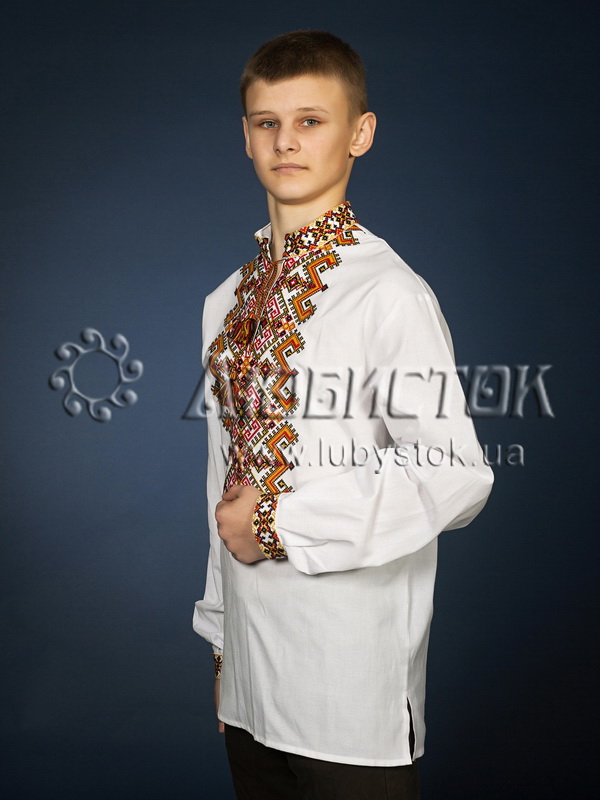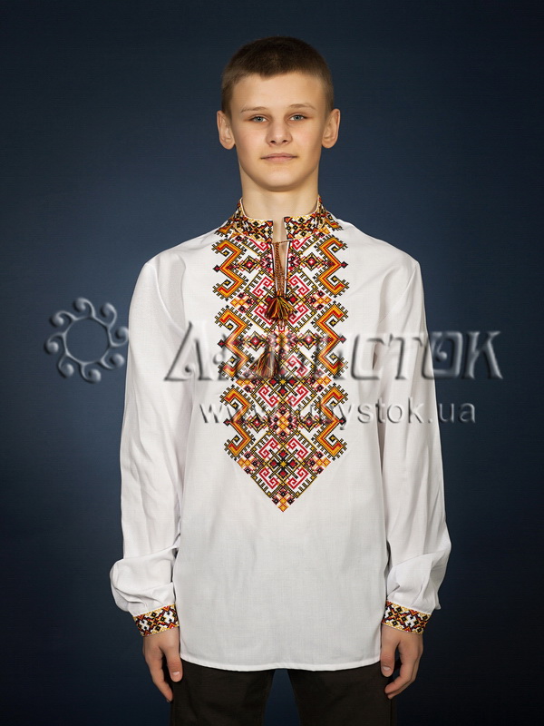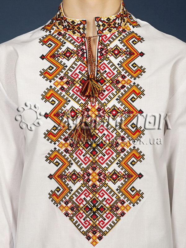 Вишита сорочка чоловіча - вишиванка хрестиком С 25-1 на домотканному полотні або натуральному льоні. Візерунок-оберіг в українському гуцульському стилі акриловими нитками. Традиційний крій сорочки на довгий рукав з коміром-стійкою. Вишивка на грудях, кінцях рукавів, комірі.