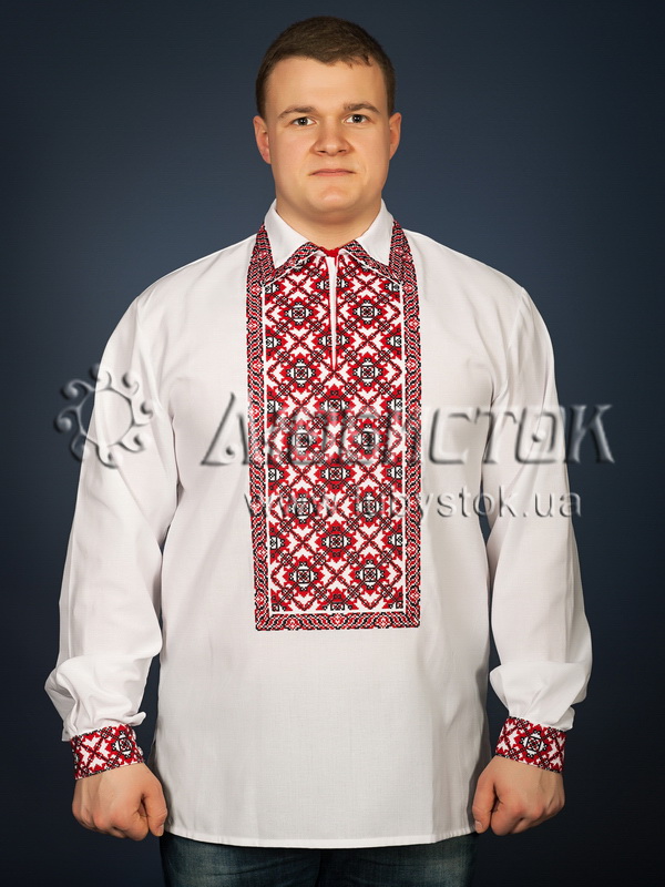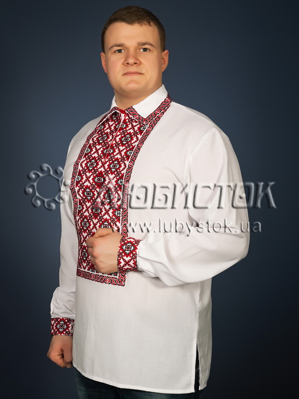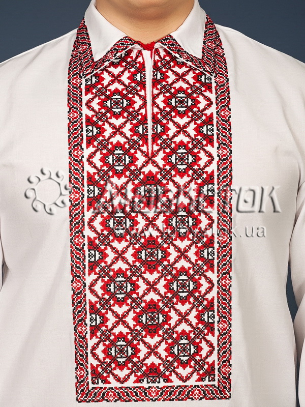 Вишита сорочка чоловіча - вишиванка хрестиком ЧСВ 26-1 на домотканному полотні або натуральному льоні. Візерунок червоними та чорними акриловими нитками з геометричним орнаментом. Сучасний крій сорочки на довгий рукав з відкладним коміром. Вишивка на грудях, кінцях рукавів, комірі. Буде пасувати чоловікам, що мають великий розмір сорочки.