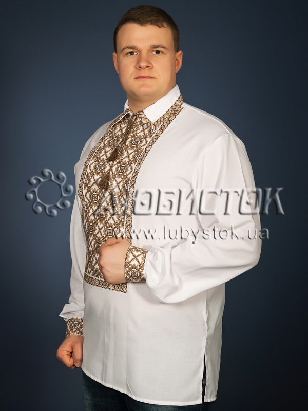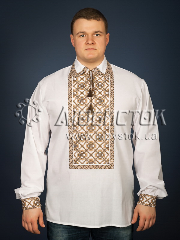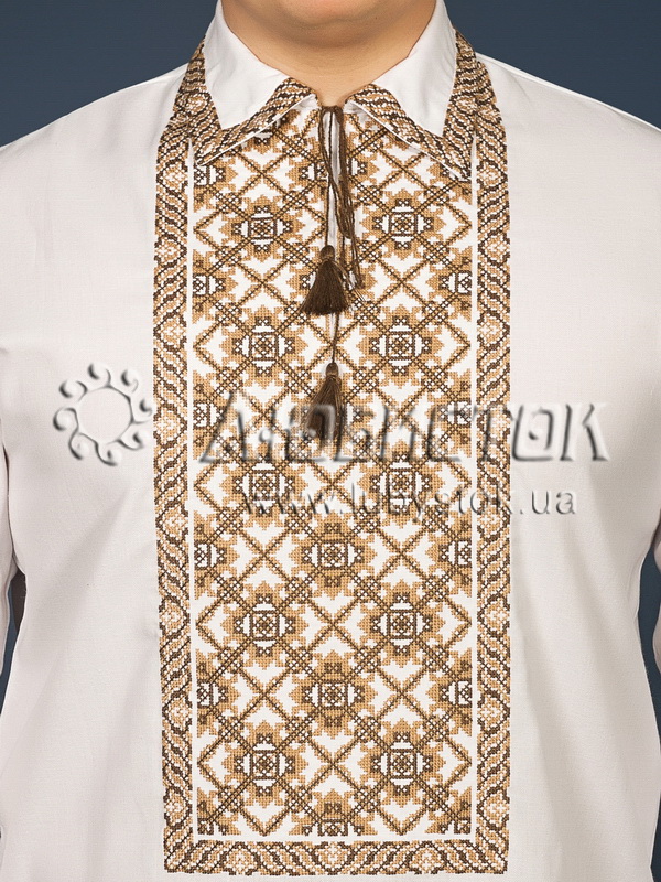 Вишита сорочка чоловіча - вишиванка хрестиком ЧСВ 26-3 на домотканному полотні або натуральному льоні. Візерунок коричневими акриловими нитками з геометричним орнаментом. Сучасний крій сорочки на довгий рукав з відкладним коміром. Вишивка на грудях, кінцях рукавів, комірі. Буде пасувати чоловікам, що мають великий розмір сорочки.