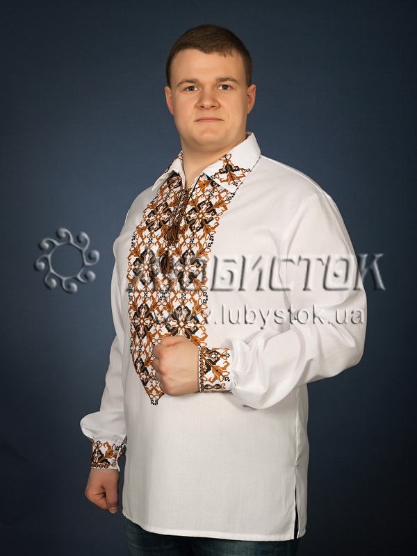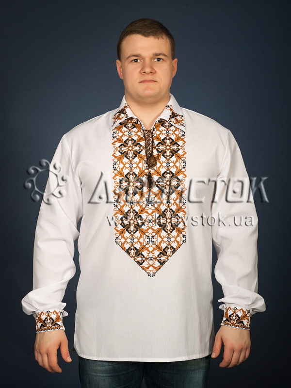 Вишита сорочка чоловіча - вишиванка хрестиком ЧСВ 27-1 на домотканному полотні або натуральному льоні. Візерунок коричневими акриловими нитками з рослинним орнаментом. Сучасний крій сорочки на довгий рукав з відкладним коміром. Вишивка на грудях, кінцях рукавів, комірі.