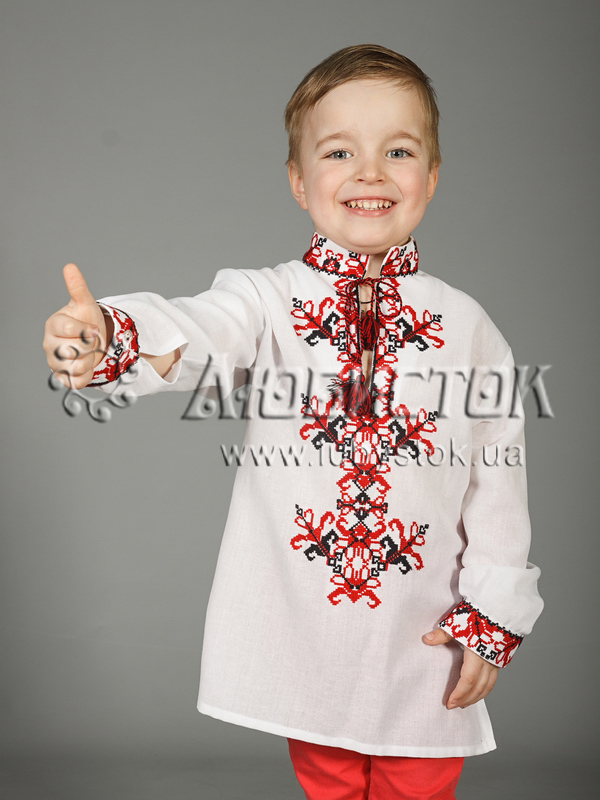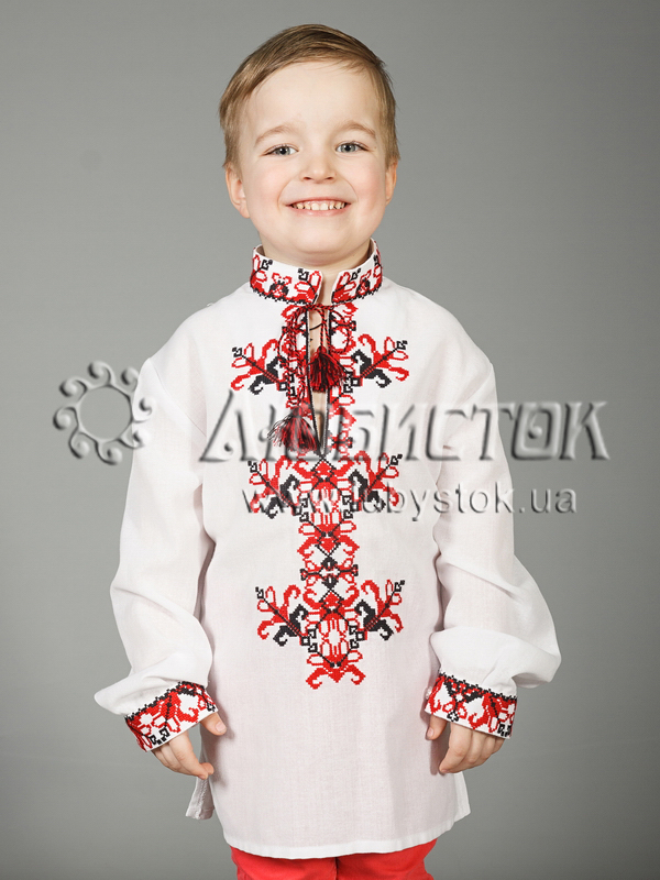 Вишита сорочка дитяча - вишиванка для хлопчика хрестиком ЧСВ 28-3-Д на домотканному полотні. Традиційний український крій сорочки на довгий рукав з коміром-стійкою. Вишивка на грудях, кінцях рукавів, комірі-стійці.