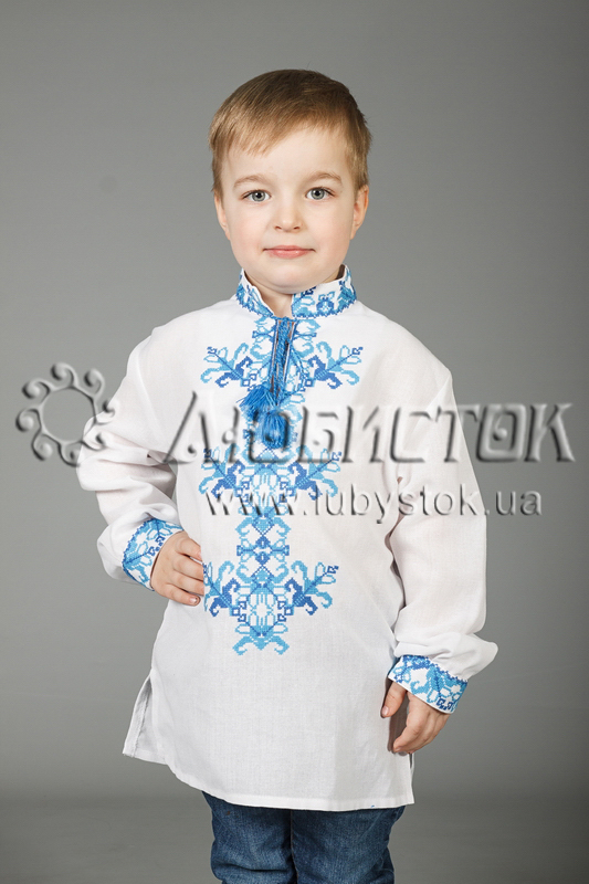 Вишита сорочка дитяча - вишиванка для хлопчика хрестиком ЧСВ 28-5-Д на домотканному полотні. Традиційний український крій сорочки на довгий рукав з коміром-стійкою. Вишивка на грудях, кінцях рукавів, комірі-стійці.