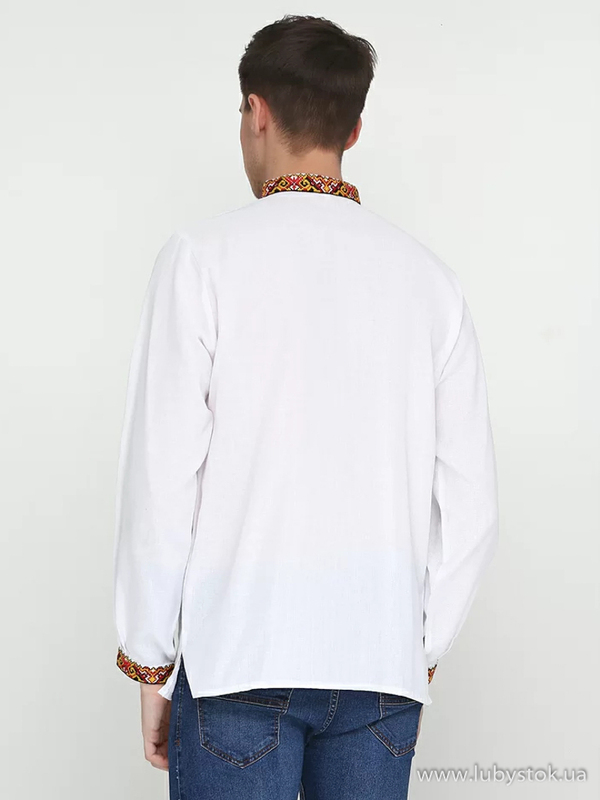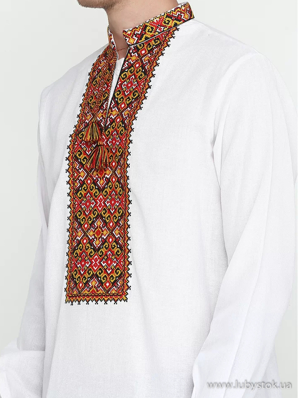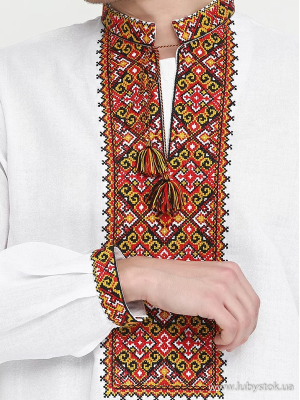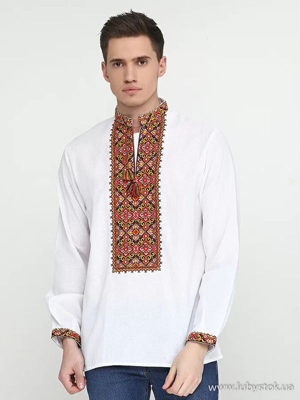 Вишита сорочка чоловіча - вишиванка хрестиком С 29-1. Традиційний український крій сорочки з домотканного полотна або натурального льону. Візерунок-оберіг в три кольори червоними, темно коричневими та помаранчевими акриловими нитками, виконано геометричним орнаментом. Рукав довгий, комір-стійкою. Вишивка на грудях, манжетах та комірі-стійці. Ця сорочка чудово підійде для святкування будь-яких подій.
