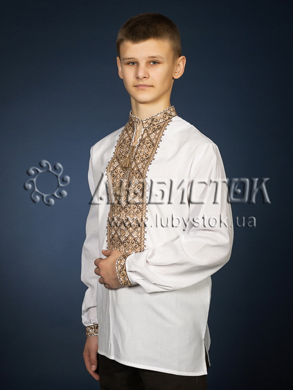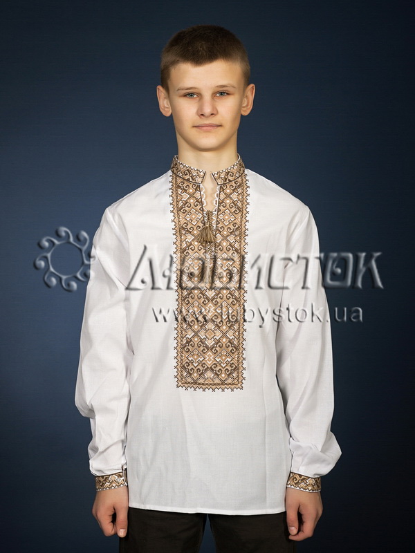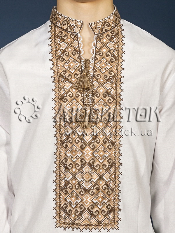 Вишита сорочка чоловіча - вишиванка хрестиком С 29-3. Традиційний український крій сорочки з домотканного полотна або натурального льону. Візерунок-оберіг в три кольори темно коричневими, коричневими та беживими акриловими нитками, виконано геометричним орнаментом. Рукав довгий, комір-стійкою. Вишивка на грудях, манжетах та комірі-стійці. Ця сорочка чудово підійде для святкування будь-яких подій.