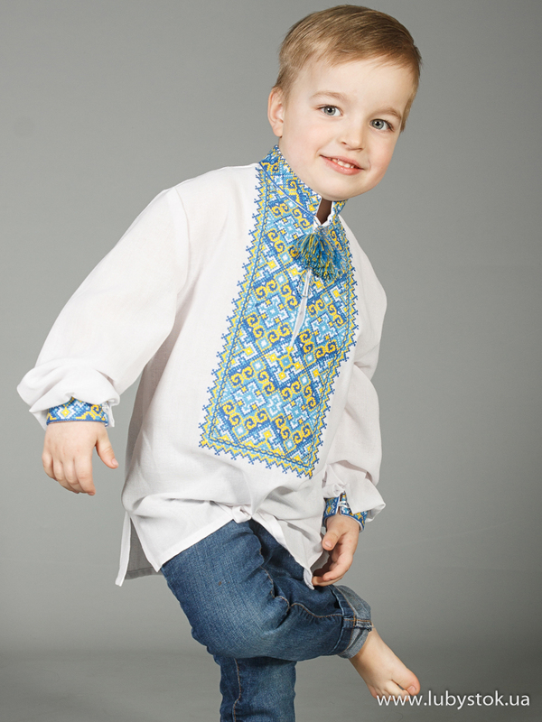 Вишита сорочка дитяча - вишиванка для хлопчика хрестиком ЧСВ 29-7-Д на домотканному полотні. Традиційний український крій сорочки на довгий рукав з коміром-стійкою. Вишивка на грудях, кінцях рукавів, комірі-стійці.