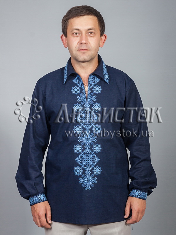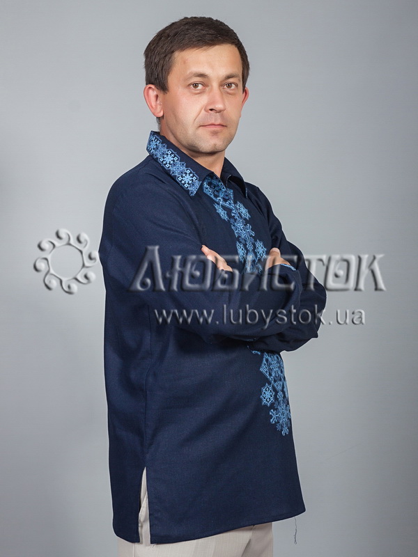 Вишита сорочка чоловіча - вишиванка хрестиком ЧСВ 32-1. Завдяки фасону та кольру має оригінальний вигляд. Сучасний крій сорочки з темно синього натурального льону. Вишиванка виконана хрестиком, геометричним візерунком, блакитними та світло блакитними акриловими нитками. На довгий рукав з відкладним коміром. Вишивка на грудях, манжетак та комірі. Ця сорочка чудово підійде для урочистих подій та святкових днів.