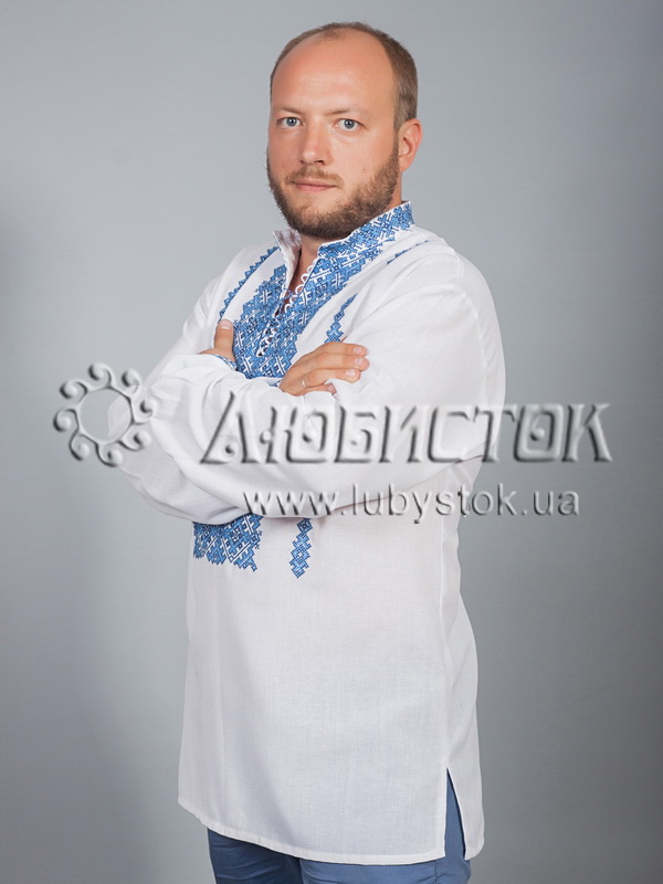 Оригінальна вишиванка хрестиком - вишита сорочка чоловіча С 34-1. Особливістю є додаткове розміщення двох вишитих візерунків на грудях. Вишивка блакитними та чорними акриловими нитками на білому домотканому полотні.