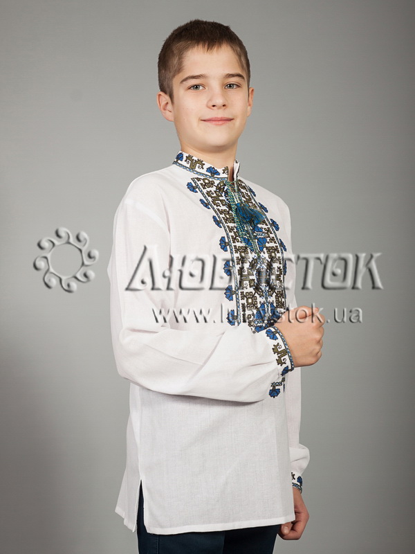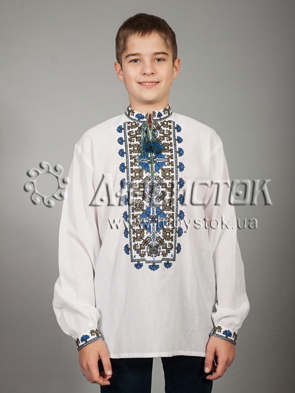 Вишита сорочка дитяча - вишиванка для хлопчика хрестиком С 40-4-Д на домотканному полотні. Традиційний український крій сорочки на довгий рукав з коміром-стійкою. Вишивка на грудях, кінцях рукавів, комірі-стійці.