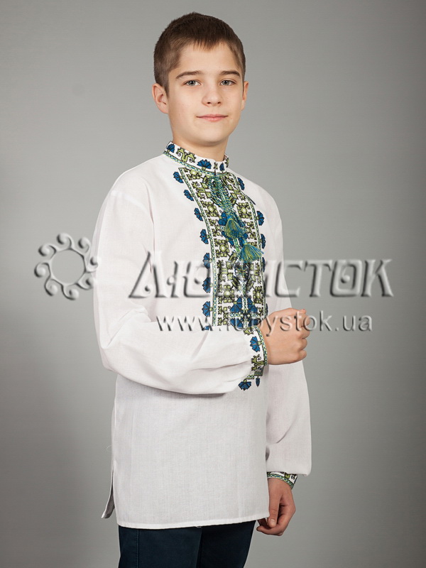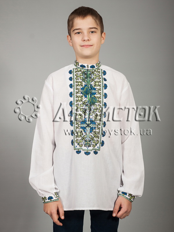 Вишита сорочка дитяча - вишиванка для хлопчика хрестиком С 40-5-Д на домотканному полотні. Традиційний український крій сорочки на довгий рукав з коміром-стійкою. Вишивка на грудях, кінцях рукавів, комірі-стійці.