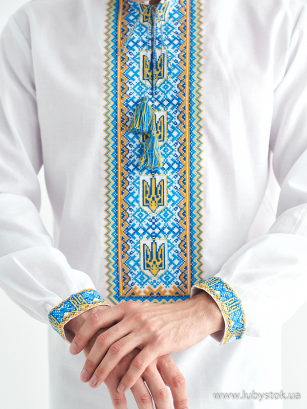 Вишита сорочка чоловіча - вишиванка хрестиком з тризубом С 45-1 на домотканній тканині з жовто-блакитним візерунком у традиційному стилі.