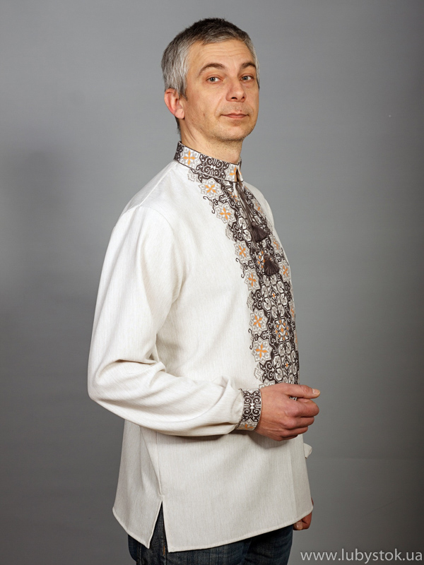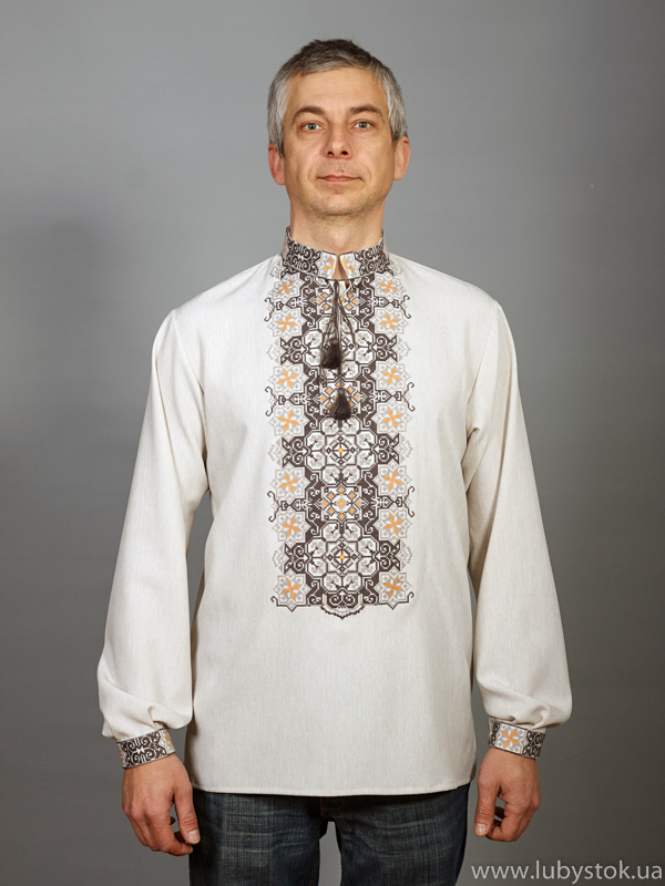 Вишита сорочка чоловіча - вишиванка хрестиком ЧСВ 47-1L. Завдяки оригінальному візерунку має особливий вигляд. Традиційний український крій сорочки з тканини білого стрейч льону. Вишиванка виконана хрестиком коричневими та бежевими акриловими нитками, геометричним візерунком. На довгий рукав з коміром-стійкою. Вишивка на грудях, манжетак та комірі-стійці. Підійде як для святкових так і для днів коли хочеться мати особливий вигляд.