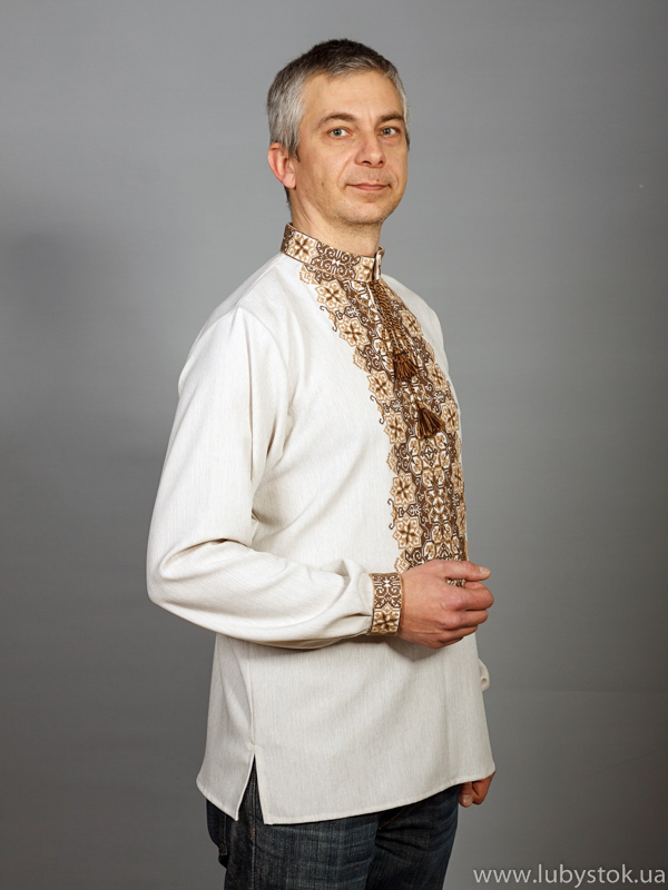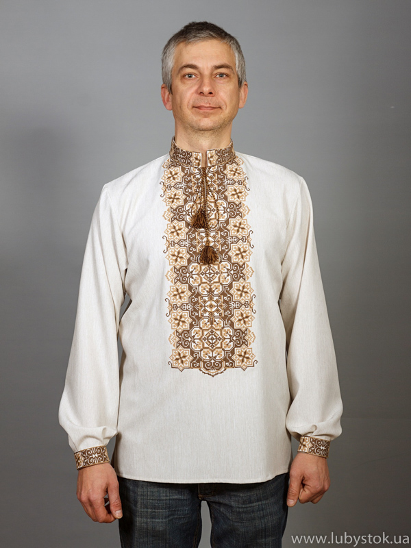 Вишита сорочка чоловіча - вишиванка хрестиком ЧСВ 47-3L. Завдяки оригінальному візерунку має особливий вигляд. Традиційний український крій сорочки з тканини білого стрейч льону. Вишиванка виконана хрестиком коричневими та беживими акриловими нитками, геометричним візерунком. На довгий рукав з коміром-стійкою. Вишивка на грудях, манжетак та комірі-стійці. Підійде як для святкових так і для днів коли хочеться мати особливий вигляд.