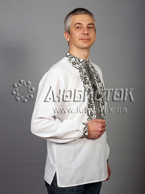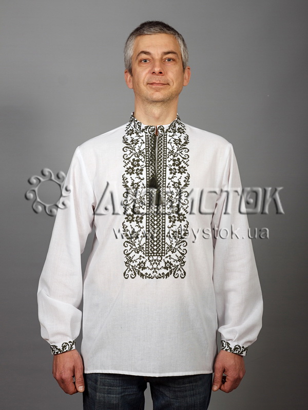 Вишита сорочка чоловіча - вишиванка хрестиком С 48-5. Через оригінальний візерунок має особливий вигляд. Традиційний український крій сорочки з білої домотканої тканини або натурального льону. Вишиванка виконана хрестиком темно-зеленими акриловими нитками, геометричним та рослинним візерунком у вигляді квітів. На довгий рукав з коміром-стійкою. Вишивка на грудях, манжетак та комірі-стійці. Чудово підійде як для святкових так і для днів коли хочеться мати особливий вигляд.