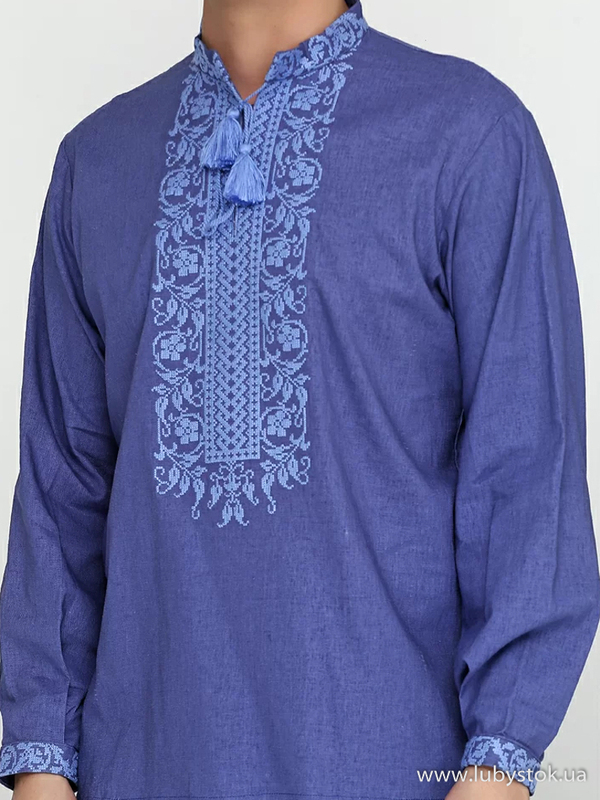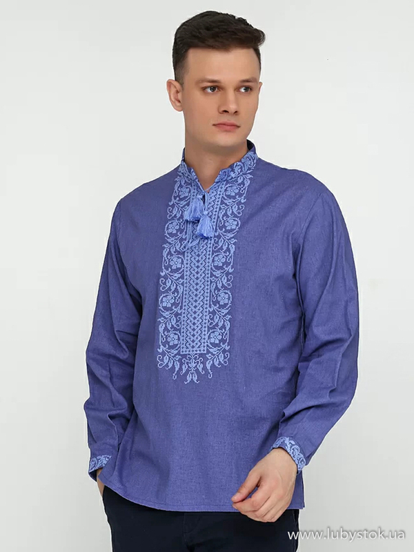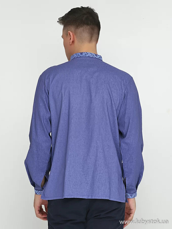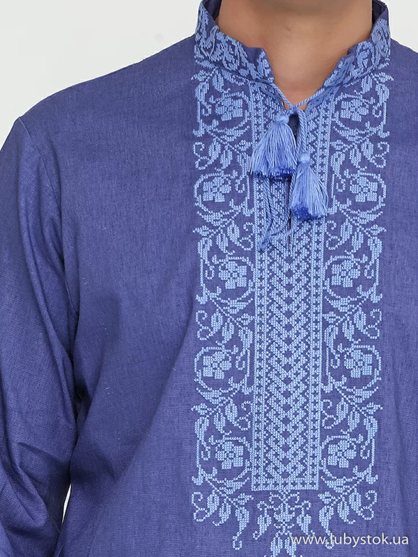 Вишиванка хрестиком - вишита сорочка чоловіча С 54-1 на фіолетовому (колір джинс) льоні. Сучасна вишиванка з традиційним кроєм на довгий рукав та комір-стійку та рослинно-геометричним візерунком.